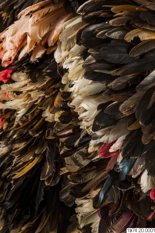 Fjäderskrud med huva som drags över huvudet. Egentligen hör det en mask till dräkten. Kingsley´s "Travels in the West Africa", bild "Death-dance Costumes, Old Calabar (p 335) synes liknande dräkter. Av Mansfield "Urwald-Dokumente" (passim) framgår detta område. Längd: 130 cm. Fotat 2017 inför utställningen Feathers 2018. Dräkten och masken kommer från samma område, men är insamlade vid olika tid...
