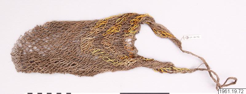 Nätväska av snören. Framsidan upptill mönstrad genom att snörena på vissa ställen virade med orkidéfiber i gula nyanser. Höjd med bärband: 57 cm. Insamlad av donator under en expedition till Nya Guinea.
