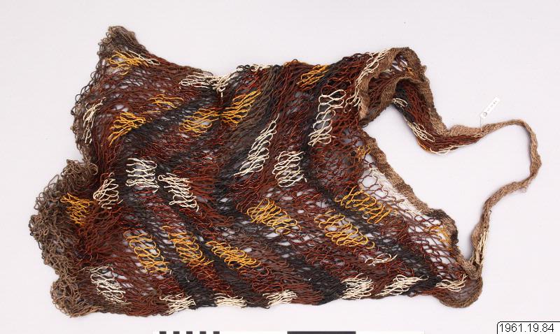 Större nätväska av snören. Båda sidor mönstrade i gult, brunvitt, brunt och blåsvart. På baksidan endast med infärgning, på framsidan med färgning och omvirning av snören med orkidéfiber. vänd) Höjd med bärband: 105 cm. Insamlad av donator under en expedition till Nya Guinea.