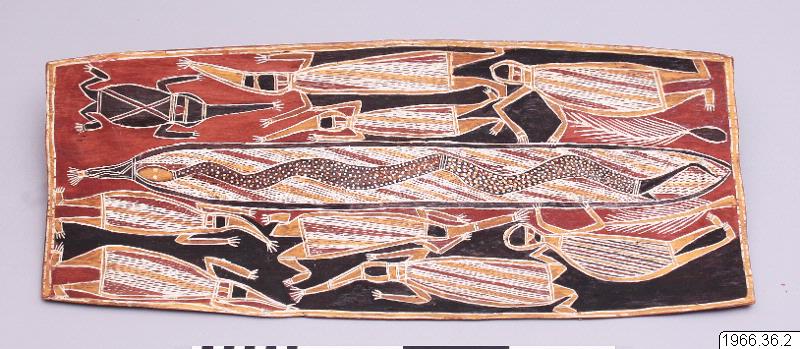• Barkmålning av Magani. Storlek: 75,5 cm x 30,5 cm. Kunapipi-ceremonierna får endast upplevas av de helt initierade männen. På denna målning reses Yermalinga-stången, Kunapipi-ceremoniernas klimax. Denna stång består bl.a. av band av mjuk bark och är