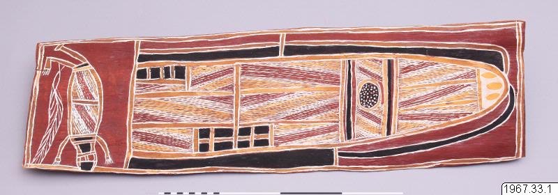 Barkmålning. Storlek: 24 cm x 90 cm. Färger: vitt, svart, gult och rödbrunt. Målningen symboliserar den förvandlade kroppen av en totemvarelse, Minigal. Han associerars med en sjukdom i luftrören. Då han i tidens början steg upp från vattnet i Nuragul-lagunen lämnade sjukdommen kvar på platsen. Slutligen återvände han dit och förvandlades till ett stort eukalyptus-träd. Detta träd undviker de infö...