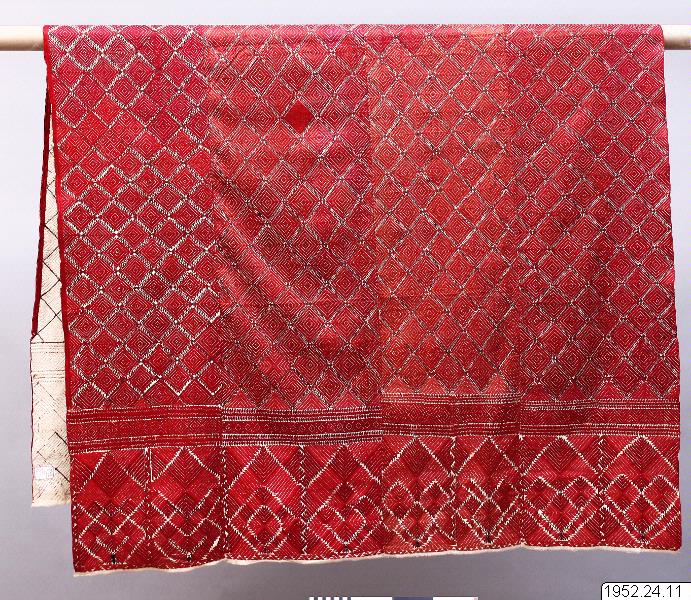 Phulkari av hazara-typ. Användes vid bröllop av bruden. När en dotter födes, påbörjar hennes morbroder en phulkari. Botten är av bomull i tuskaft. Denna är vit, naturfärg , och broderad över hela ytan med silke i rött med smärre inslag i svart. (katalogkort/originalbeskrivning)