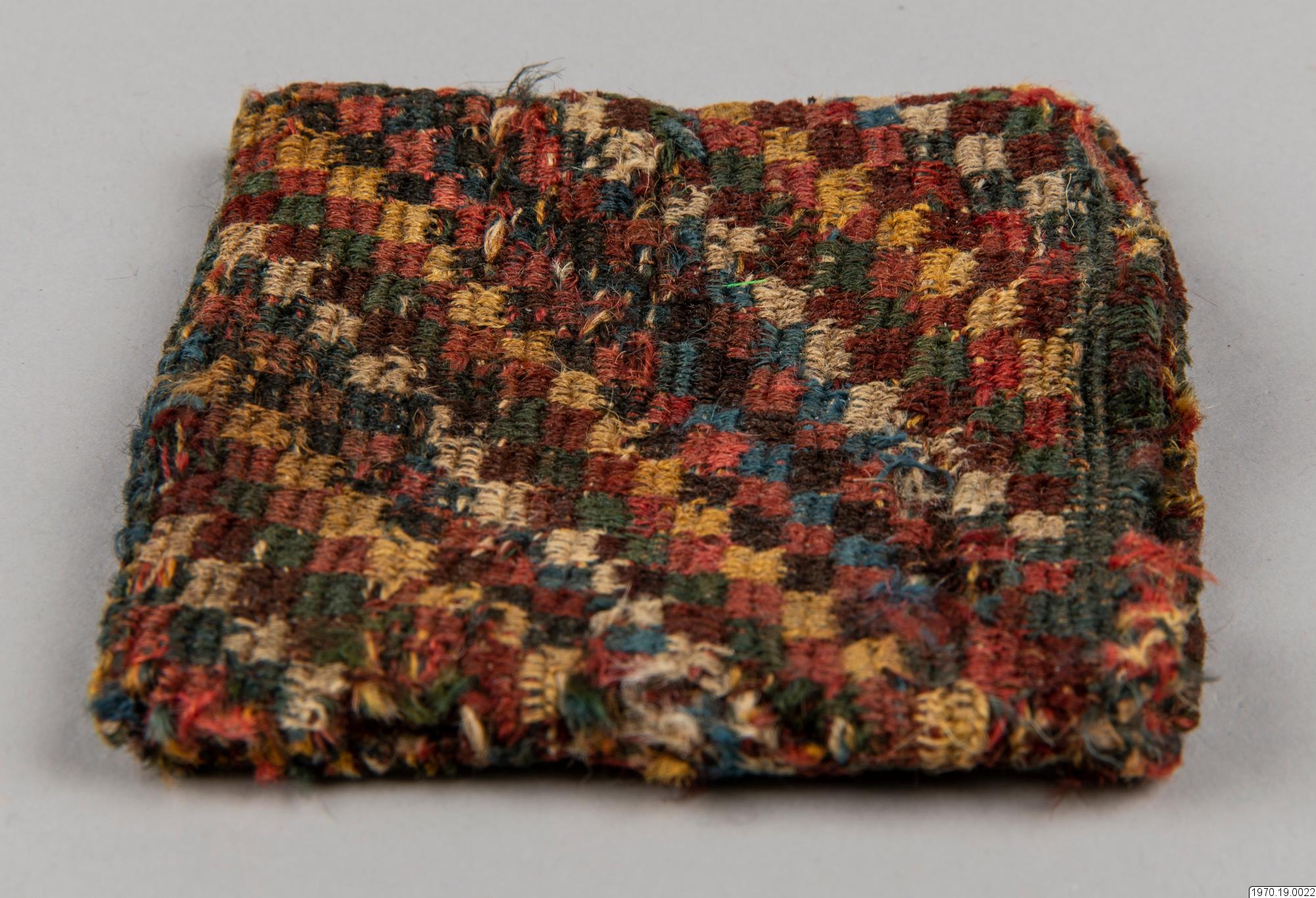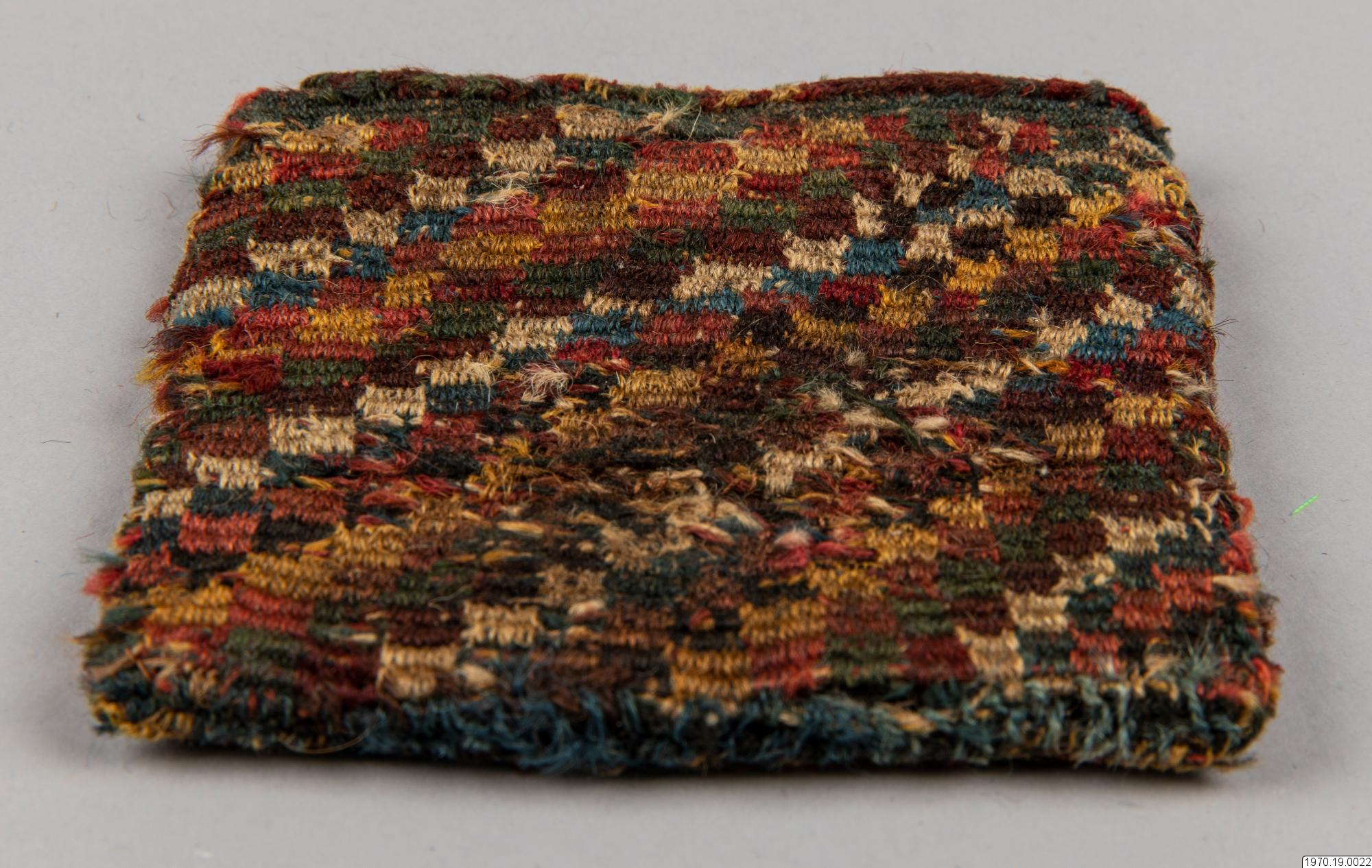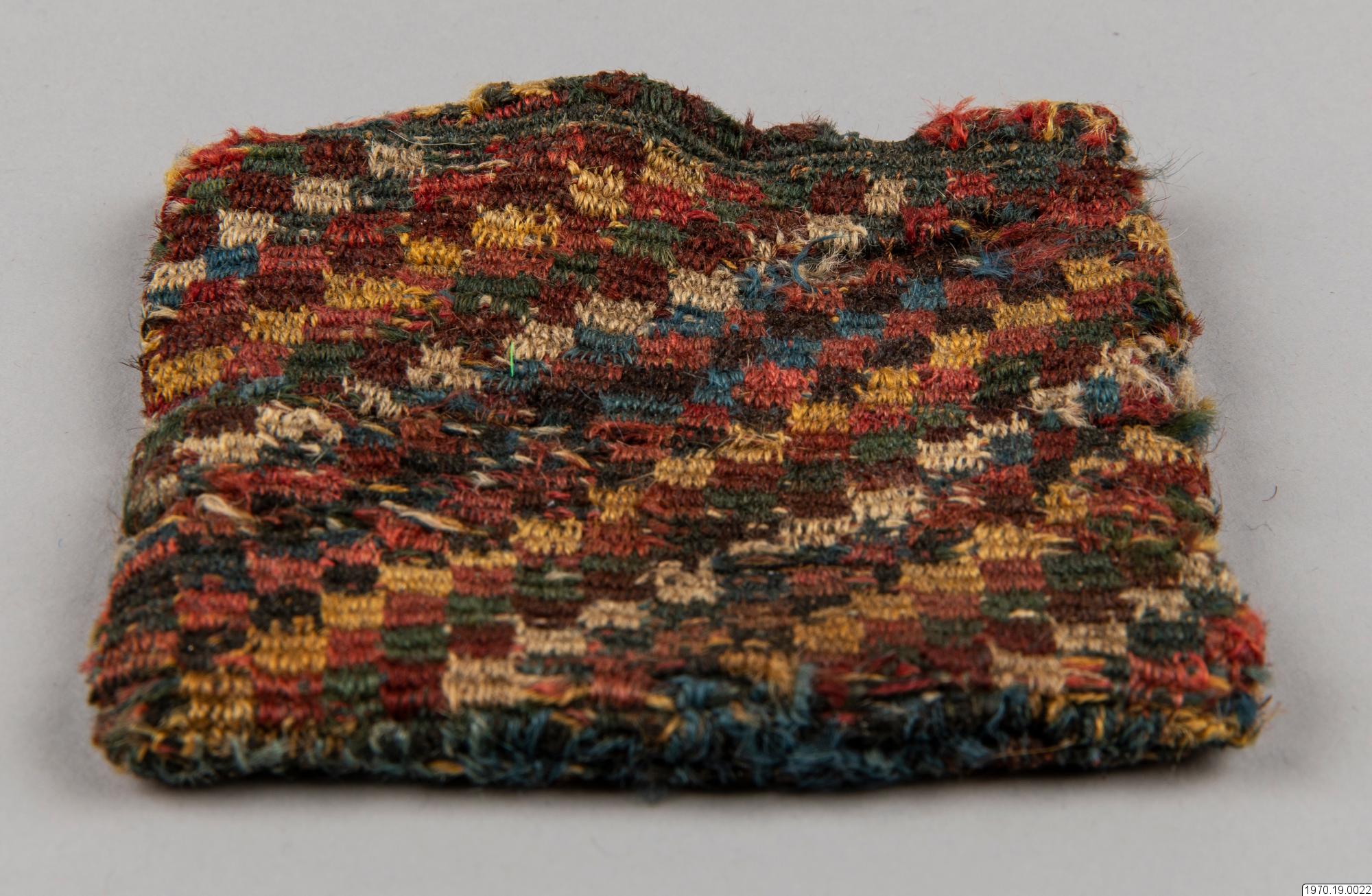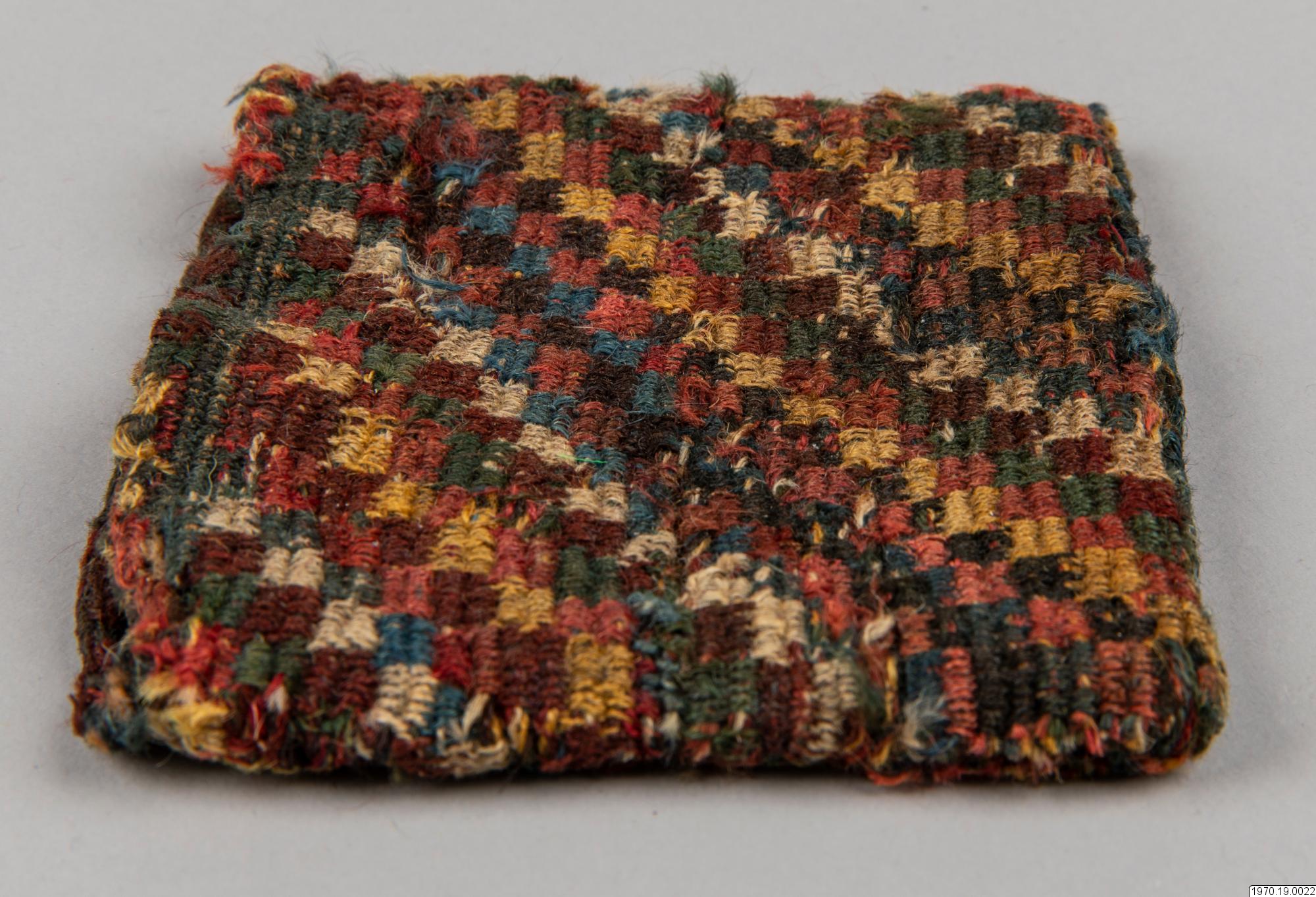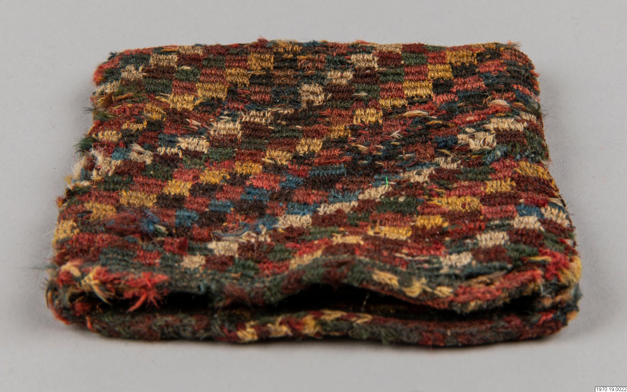 • Väska, 9 x 9,5 cm. Av garn, flerfärgad. Väskan har efter analys beskrivits av fru M.Anker i GEM på följande sätt: "Spiralteknik". Färger: Blå, vit, rosa, gul, röd-brun, mörk-grå, grön." Väskan som är gjord i spiralteknik (coiled) har en stomme av ullgarn i de olika färgerna och