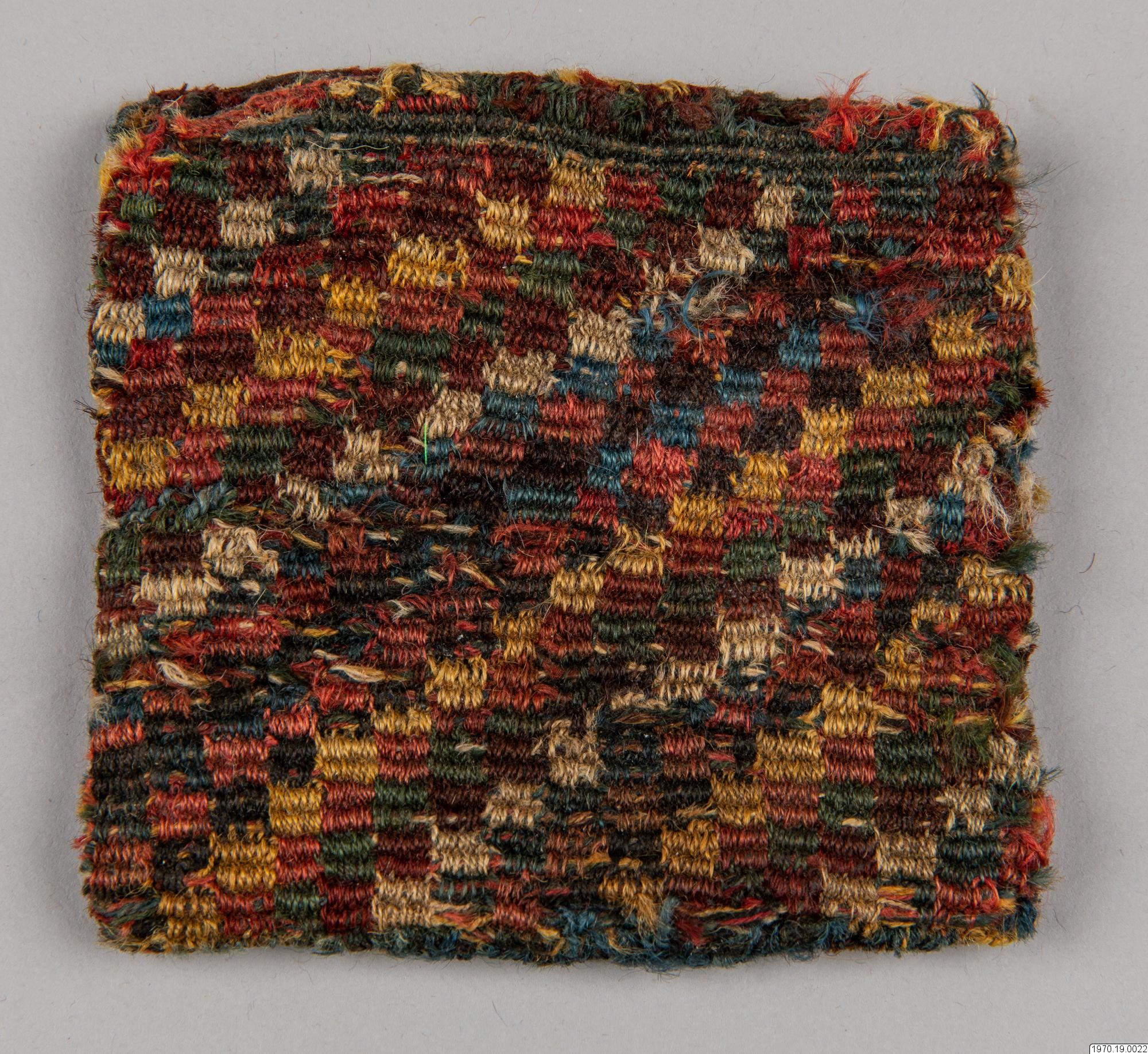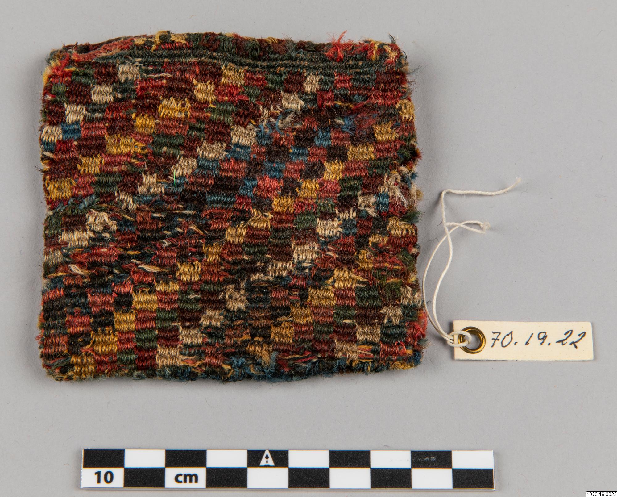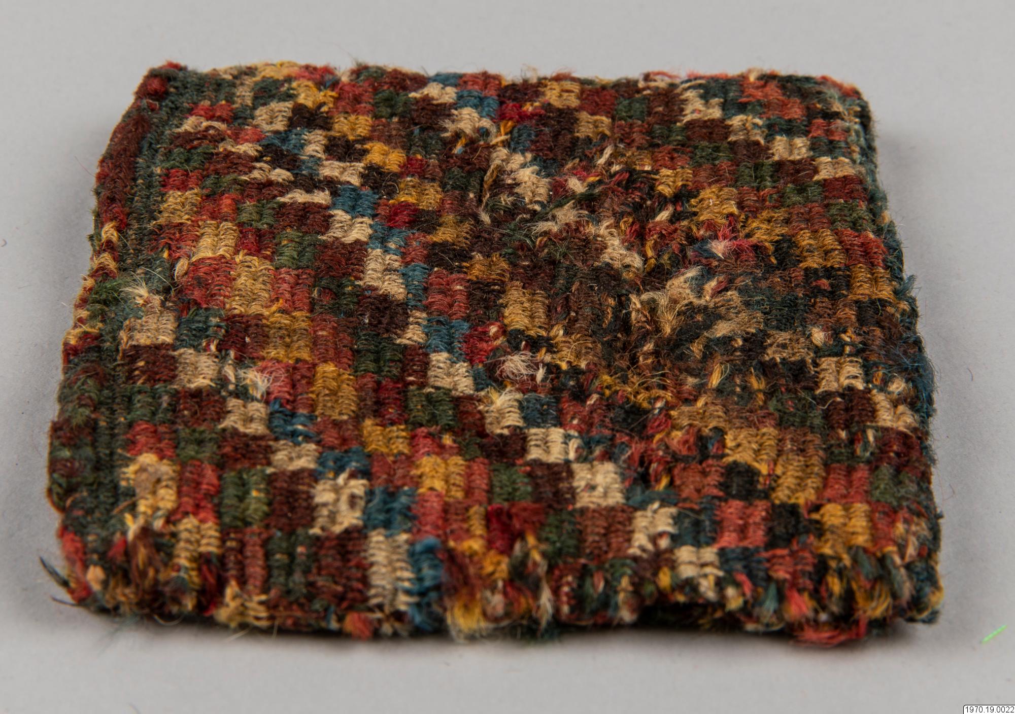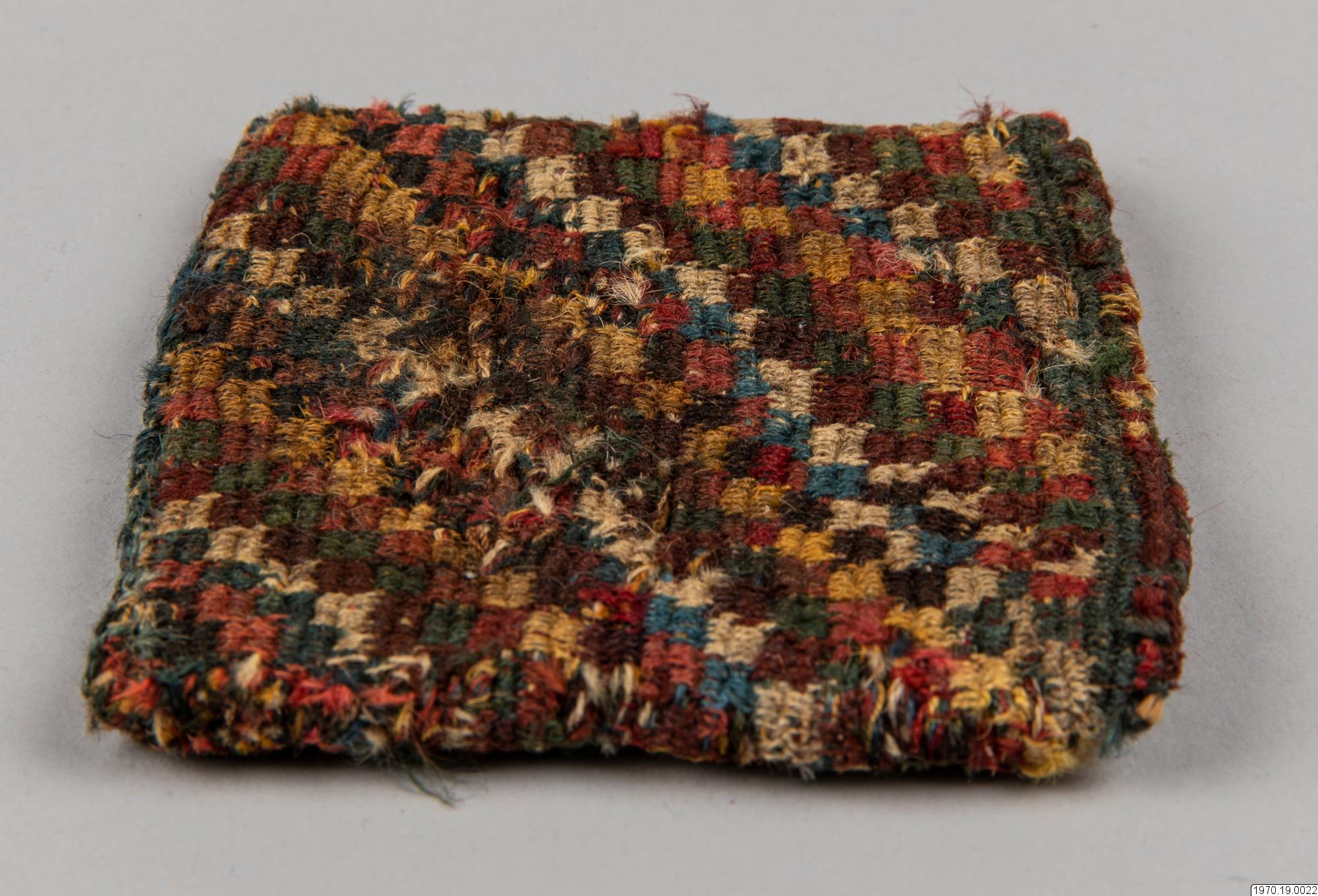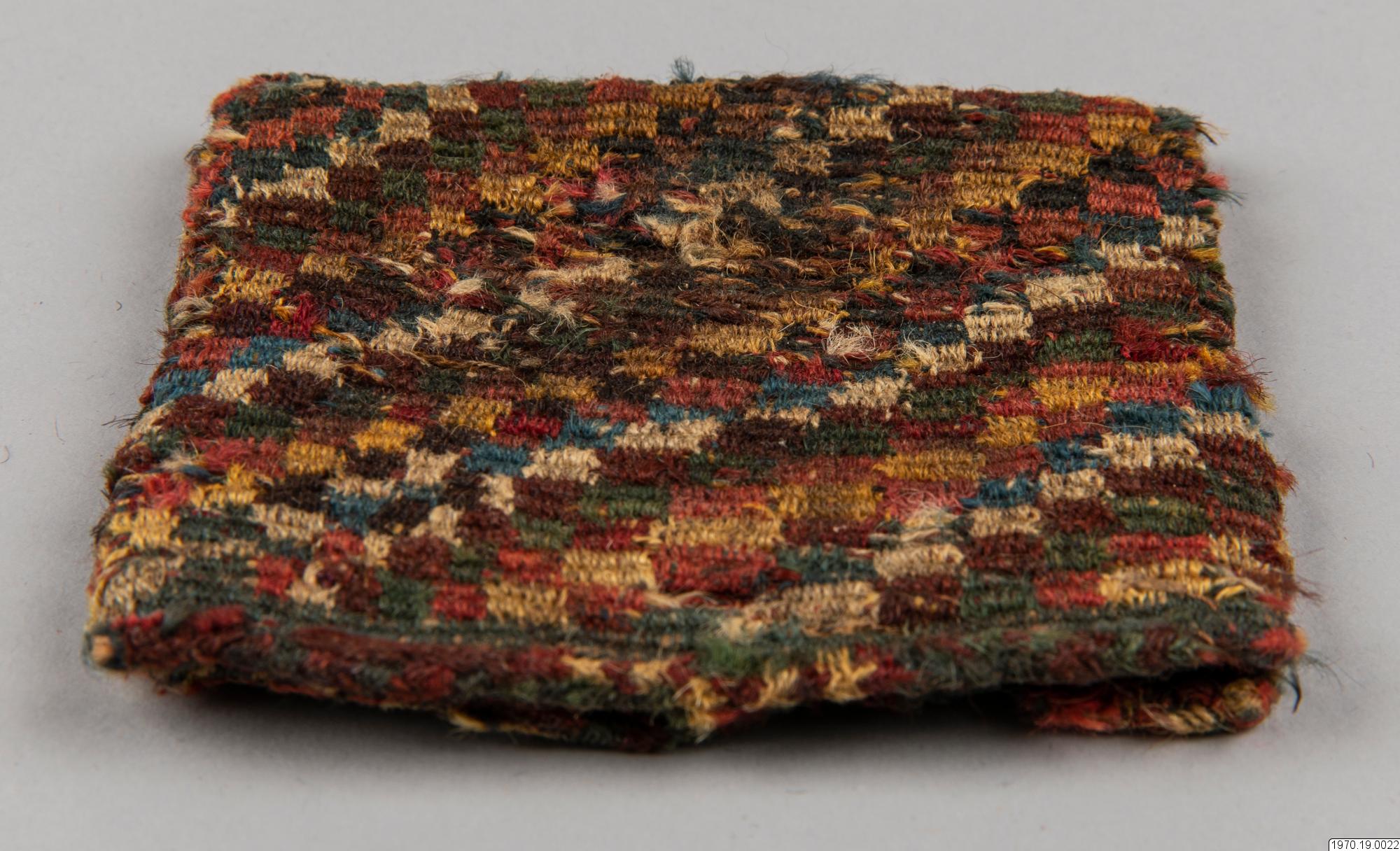 • Väska, 9 x 9,5 cm. Av garn, flerfärgad. Väskan har efter analys beskrivits av fru M.Anker i GEM på följande sätt: "Spiralteknik". Färger: Blå, vit, rosa, gul, röd-brun, mörk-grå, grön." Väskan som är gjord i spiralteknik (coiled) har en stomme av ullgarn i de olika färgerna och
