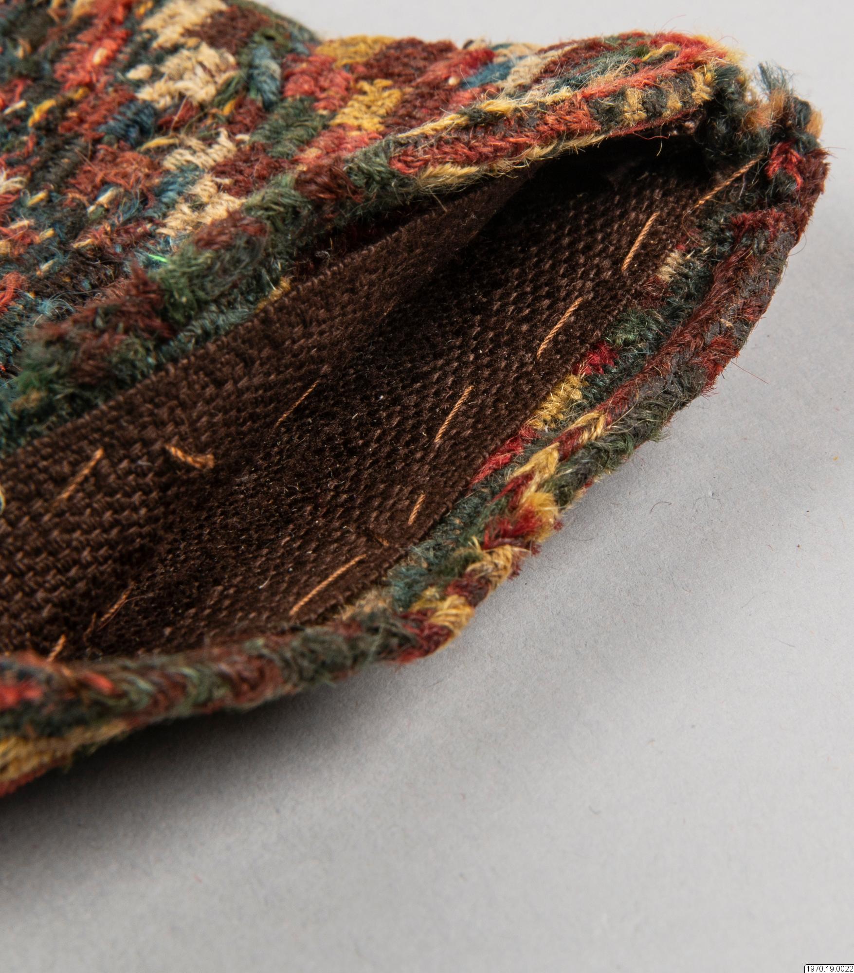 är sydd med samma garn. Garnet är 2-trådigt, Z-S-spunnet, mycket ojämt tvinnat. Runt öppningen finns rester av broderier....