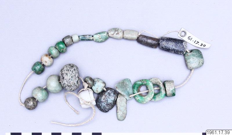 En samling av 26 s.k. cuentas av olika bergarter uppträdda på ett snöre. Den vita tillplattade "cuenta" som gör tjänst som "grepp" i upphängningstråden förefaller falla utom samlingen i övrigt vad material och form beträffar. Någon som helst garanti för att just dessa föremål hört samman eller anträffats som ett fynd finns ej. Samlarens orig.nr. 1117.