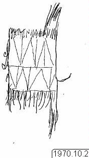7,5 cm långt fragment av tygstycke i brunt, beige, blått och rött.Gåva.