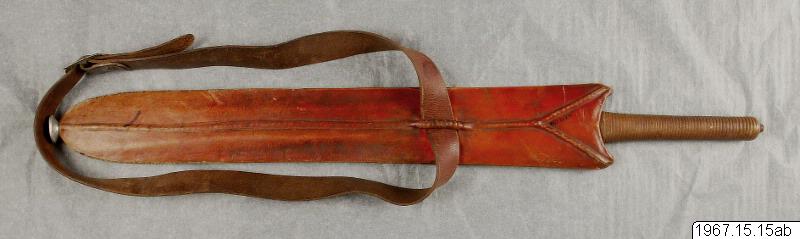 Svärd (a), av stål. Märkt: "Martindale Birmingham, Made in England, Registrerad, No 1623. Längd: 63,5 cm. Två-eggad, åslipad klinga, avsmalnande mot fästet. handtag m. 14 cm. lång kavel utan knapplindat med läderband. Vid handtaget, bredd: 2,8 cm. Slidan (b) består av ett läderfodral med konkav mynning. Försedd med bärband, c:a 96 cm långt. Spänne av nickel. Ornamentering genom pressning i lädret och en "kråkssparkssöm" längs mittlinjen. Slidans längd: fr. knapp till mynning: 53
