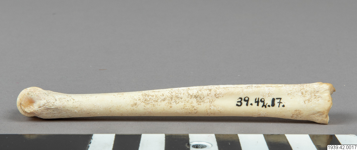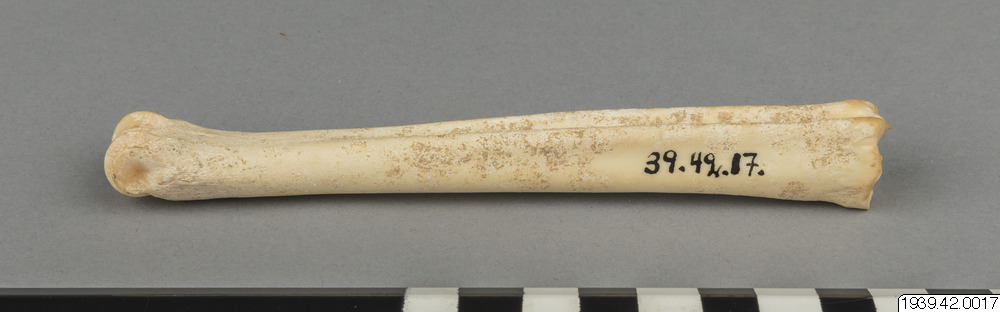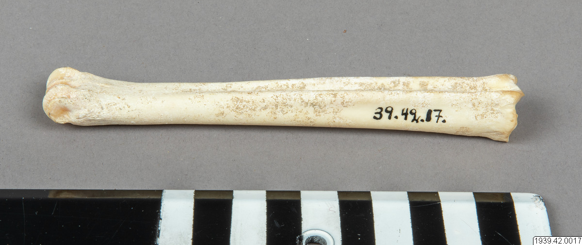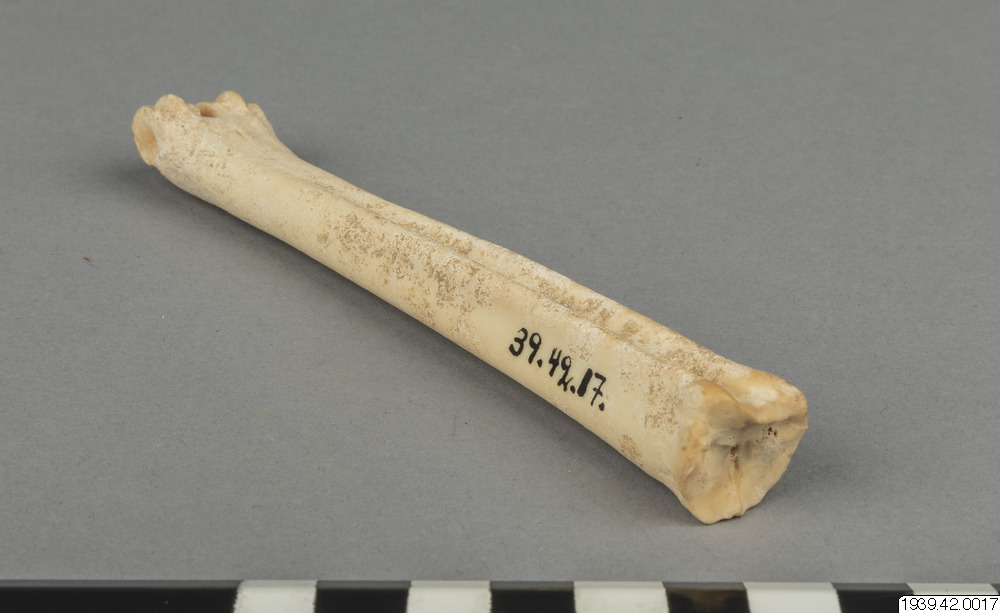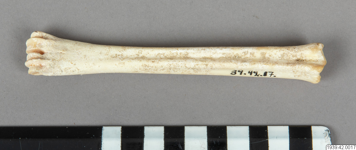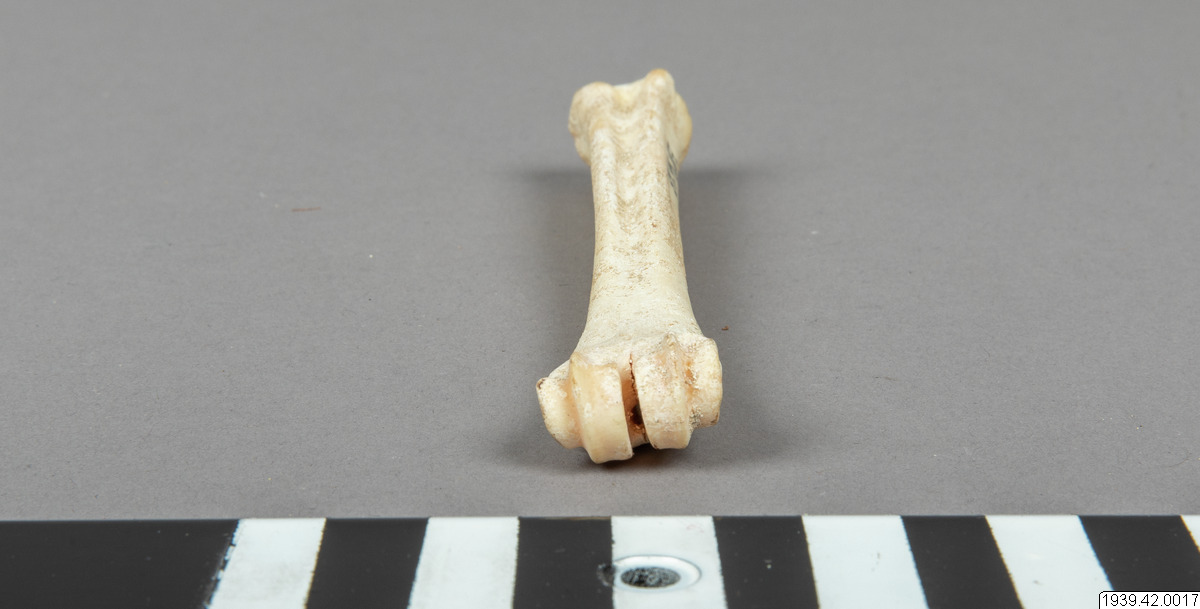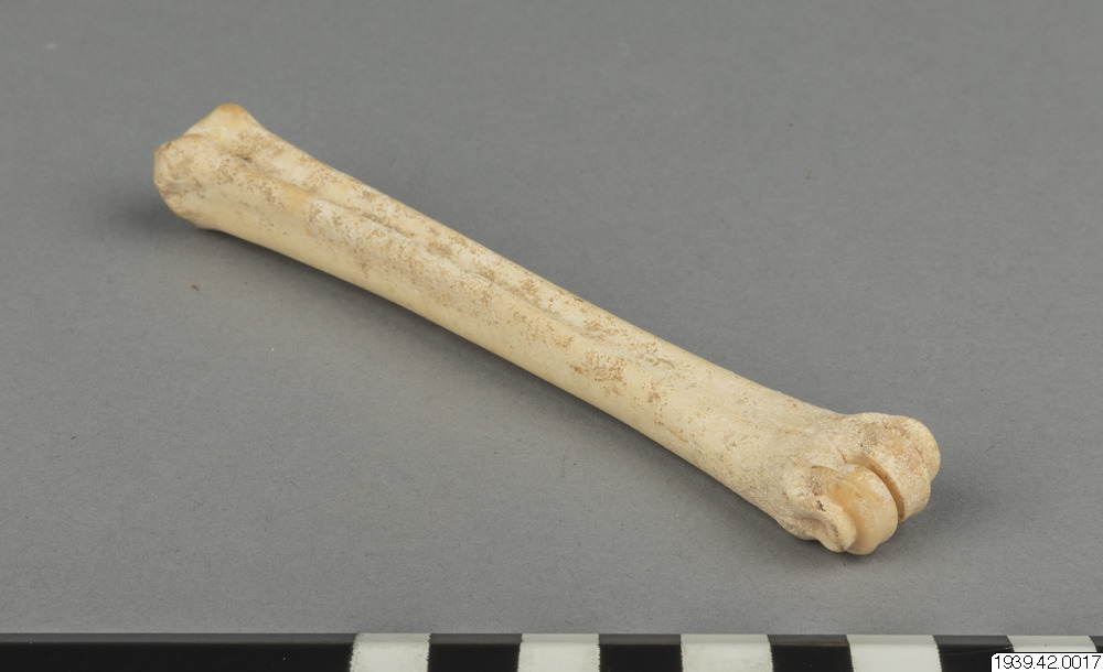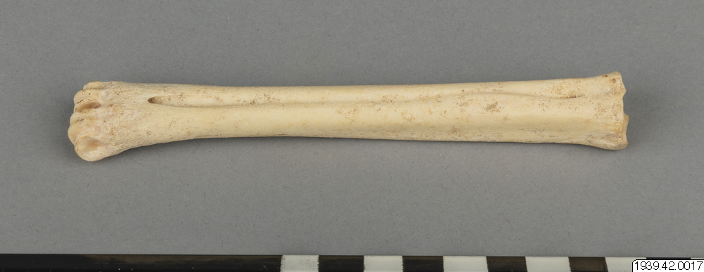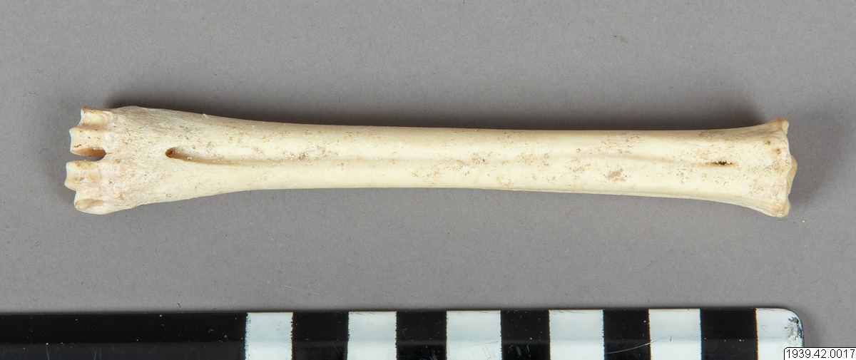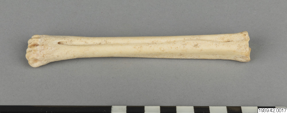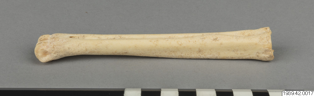 Ben av hjort. På Cuna " koe naga" av koe, hjort, och "naga" , fot, ben. Användes som skaft till kalebassskallror. Pérez orginalkatalog: "Moe naga", koe, venado; naga, pata. Pata de venado. Hueso de pata derecha del venado. Los indios cunas la usan para hacer el mango del sonajero para el uso de los kantulgana durante la fiesta de la doncella". Gåva av Ruben Pérez Kantule.