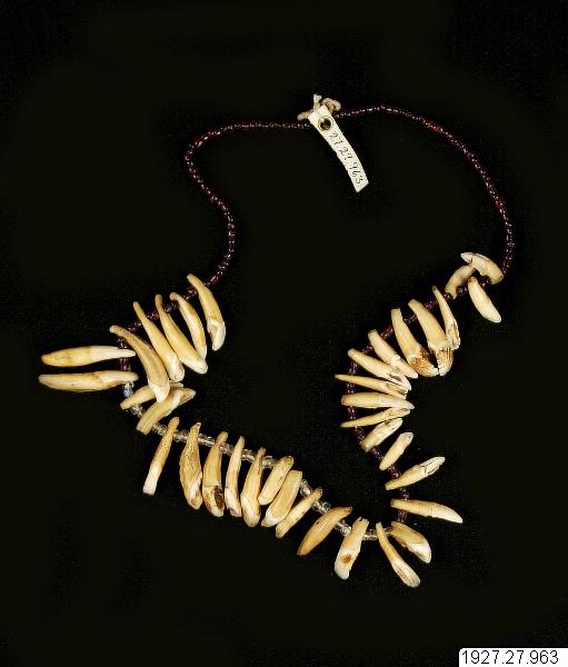 Halsband för pojke. Anm. av R. Pérez Kantule: Collar de dientes de los animales "ibtulagan nugal uini kamu kinet" Se usan los muchahos y hombres ( los hombres una o dos sortijillas), pero no las mujeres ni muchachas. Está compuesto de cuentecillos de cristales comprados de los extranjeros "uakas" , y los dientes de animales, "tigrillos, chanchos. Es un simple adorno. Los curanderos "inatuletgan" usan para un medicina.