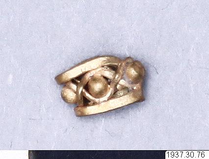 Pärla, hoptryckt, av filigran i guldlegering. Gåva av ing. Paul Bergsöe, Köpenhamn
