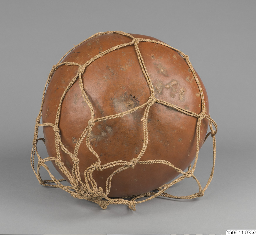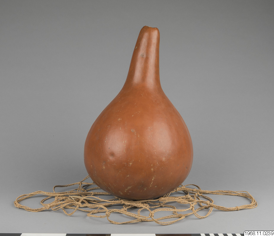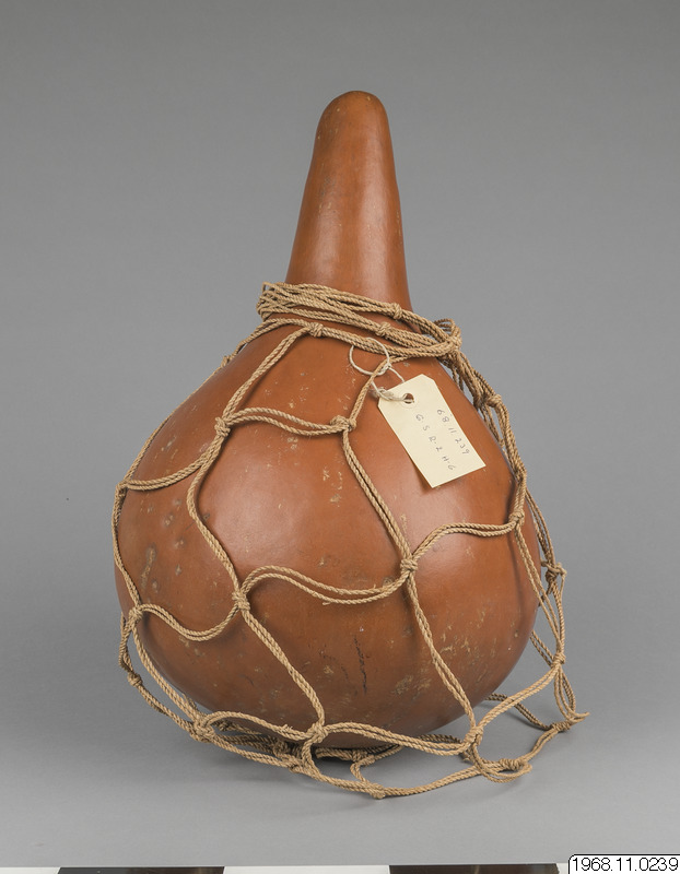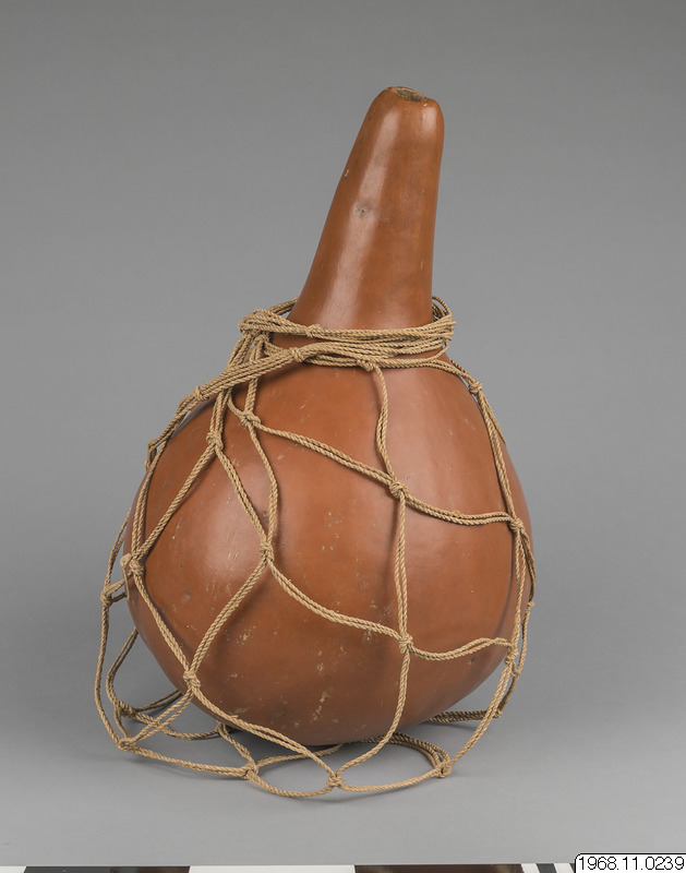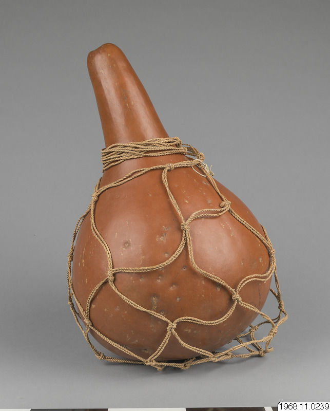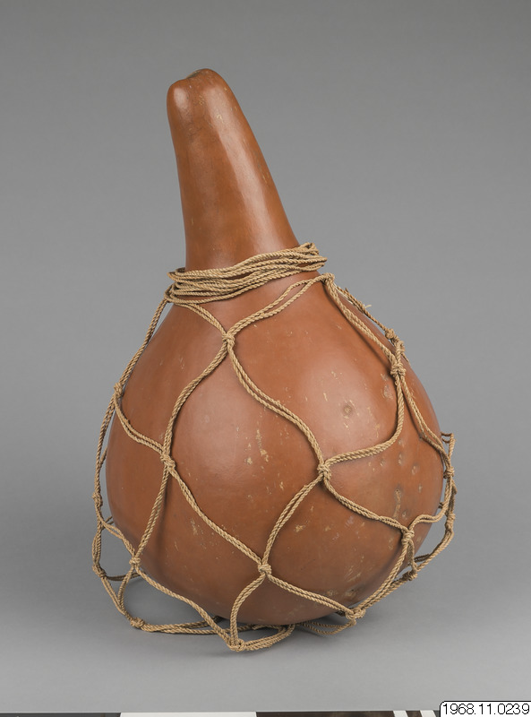 Kalebass och bärnät, "Nkalu ye lukosi" mått: 50 cm. Kalebassen är fruktskal av Lagenaria vulgaris och bärnätet: lukosi är av "mpunga"-fiber fr. spånadsväxten Cephalonema polyandrum k.Schum Gåva av insamlaren 2/9 1967