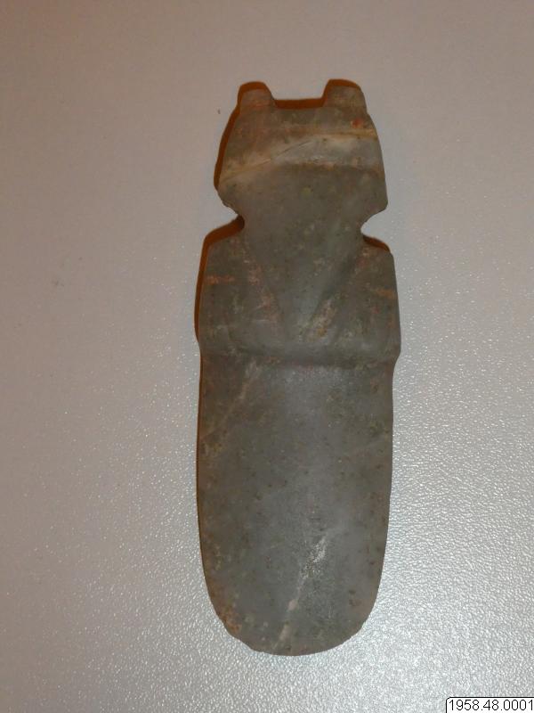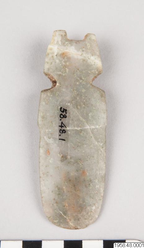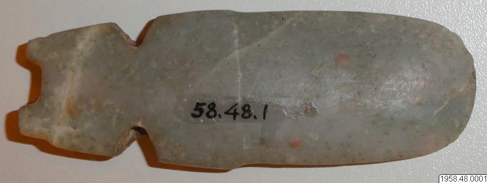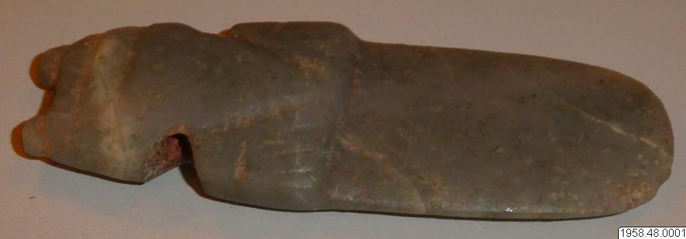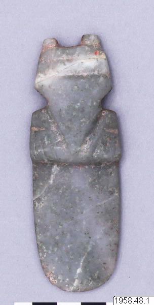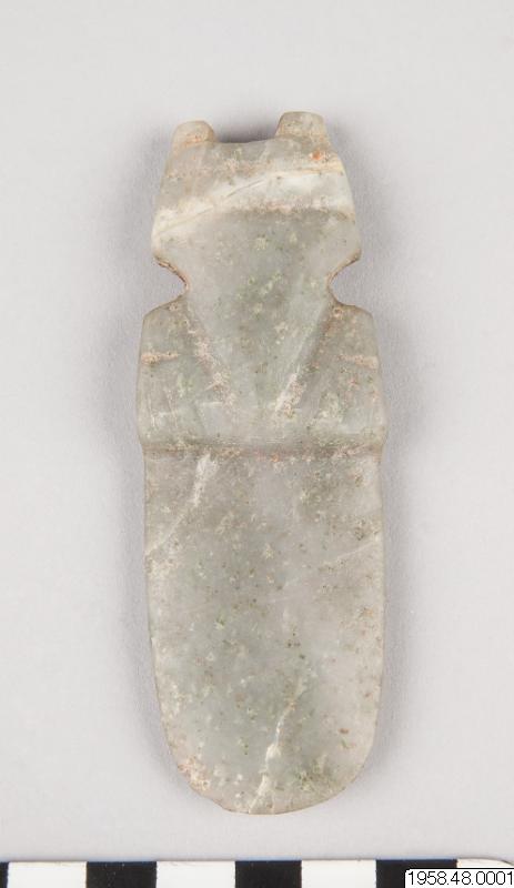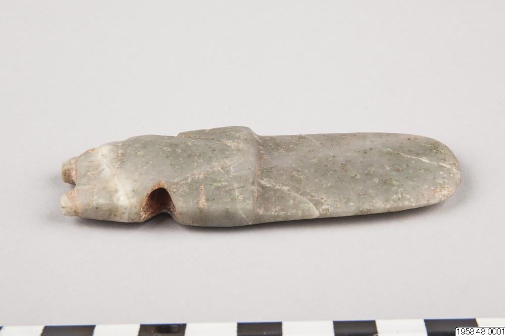 9,5 cm lång hängprydnad av jade (?), med tydliga spår av nötning. Föremålet genomborrat för att kunna bäras i en snodd. Fågelmotiv. Köp från: Sr. Angel Montoya, San José, 24/7-58.