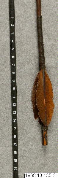 Pil, lansettformad järnspets med tånge. Skaft av elefantgräs, (Pennisetum(?)) Längd: 54 cm. Skaftet är vid tången förstärkt med fiberlindning. Styrfjädrar två st. är tangeniellet fästade. Vid skåra, bastbindning mellan och framför styrfjädrarna. Pilar av denna typ användes till kort båge med "nockar".