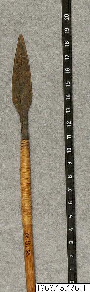 • Pil, lansettformad järnspets med tånge. Tangentiell fastsättning av styrfjädrarna. Pilens totala längd: 54,5 cm.