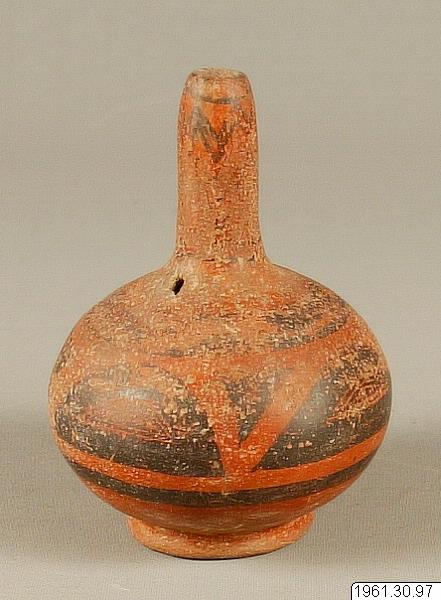 16,5 hög karaff av lergods med rak uppstående pip. Kärlkroppen globulär på låg ringfot. Dekoren i svart på brunröd grund är starkt skadad men man igenkänner de elipsformade fälten inramade breda svarta linjer samt i dessa fält stiliserade motivelement, närmasr klomotivet.