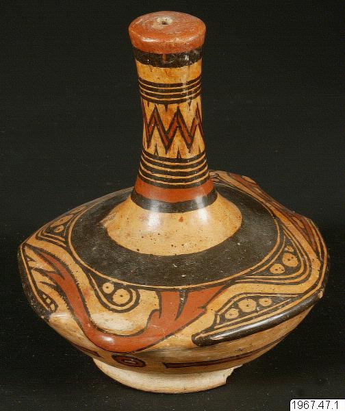 17 cm högt flerfärgat lerkärl av typen karaff, vars kärlkropp har formats som en spjutrocka ("sting-ray effigy bottle"). Kärlet har ringfot och 9 cm hög hals med litet hål. Färger i brunt, svart, beige. Rockans svans är på kärlkroppen ornamental lagd till vänster, unikt för detta exemplar, då övriga fem i samma fynd hade svansen till höger. Kärlet hade vid anträffandet en mindre defekt på ringfoten samt fick vid grävningen ett hål i godset på kroppens undersida vid vänstra frampartiet. Detta hål har ifyllts av utgrävaren-säljaren. Kärlet i övrigt intakt. Kärlet är ett av sex funna i samma grävning (se fotos i orig. katalogen). Grävningen företogs i april i Parita, som fortsättningsarbete i "Mound XI i arkeologiska fyndkomplexet HE-4 (Pr-1), Parita, Prov. Herrera, Panamá (Jfr. med samling 1966.47). Beskrivning av fyndomständigheterna i Philip L. Dades brev av 26/4 1967. :"Last Monday, eight days ago"---(d.v.s. 17/4 1967)---till brevets slut. I brevet av 21/8 1967: "The stingray effigy polychrome bottle is perhaps the most valuable in the six found. It is only one with a left turn to the tail. The others have a right turn."--"The only damage to this superb artifact is a 3/4 inch knife thrust (about the width of knife blade only) in the underside of the belly where there is no artwork of any kind and which I have carefully plugged but no retouched. Also in the ringbase there is av 3/4 inch edge missing - of absolutley no consequence."---Enligt utgerävaren (brevet av 26/4 1967) nämner S.K. Lothrop icke "bottles of this type but does illustrate two bottles of similar form from the earley Coclé period."--- Kärlet största bredd 16,5 cm.