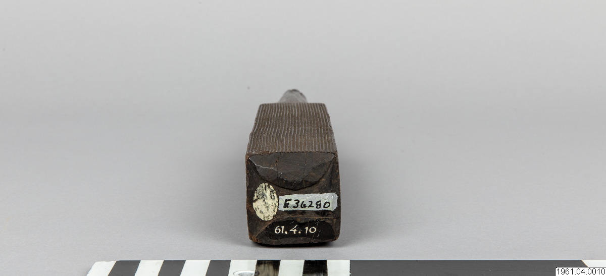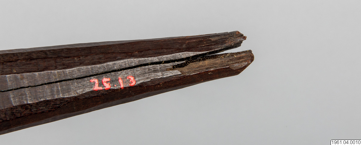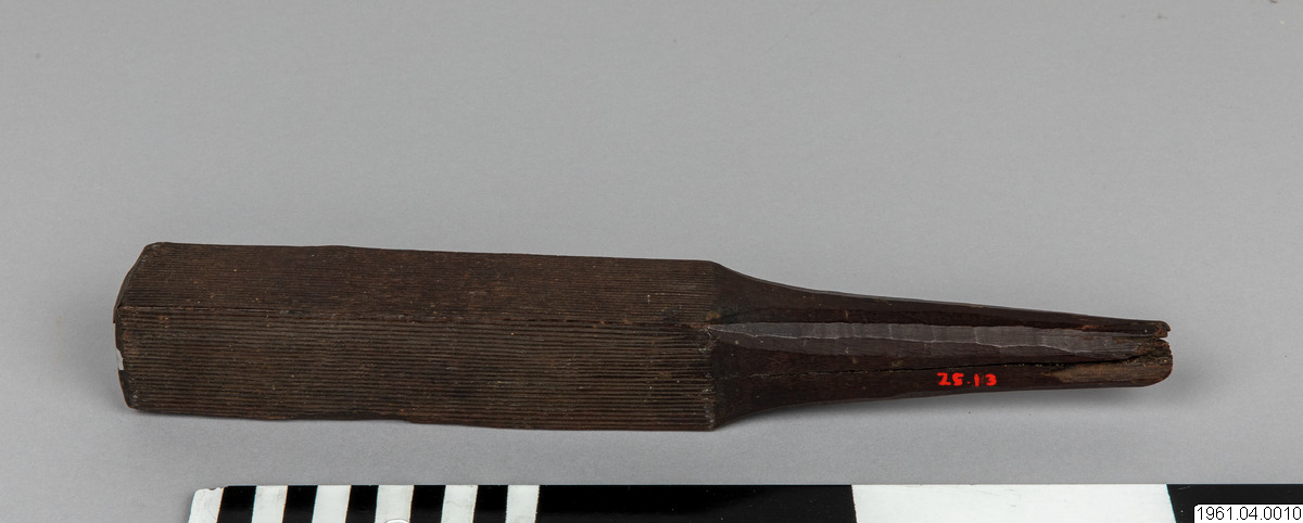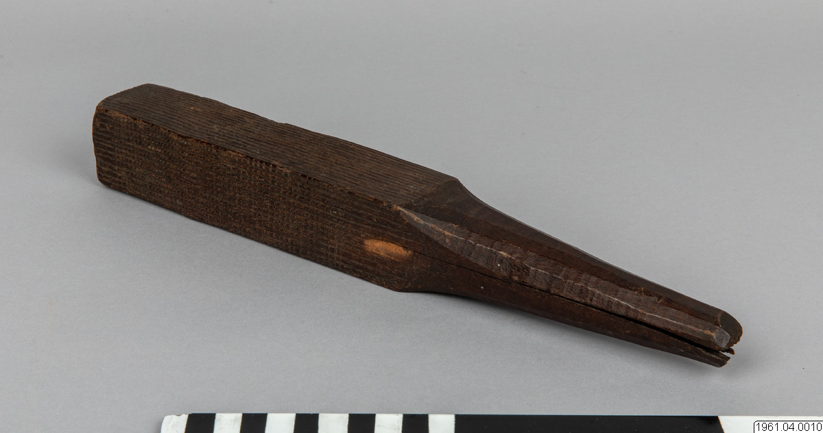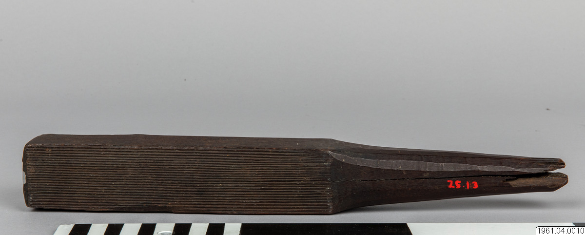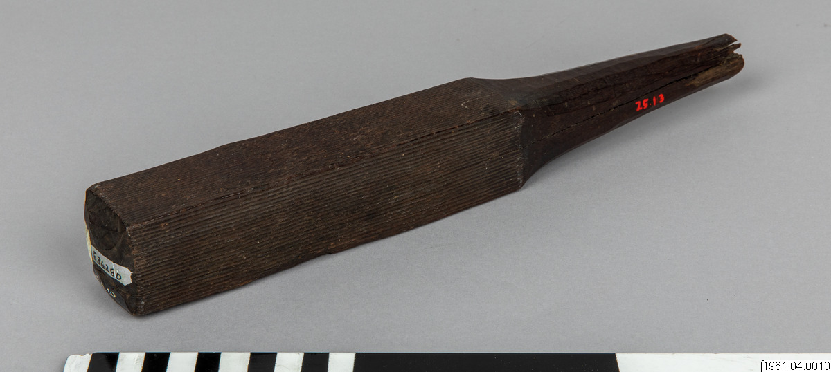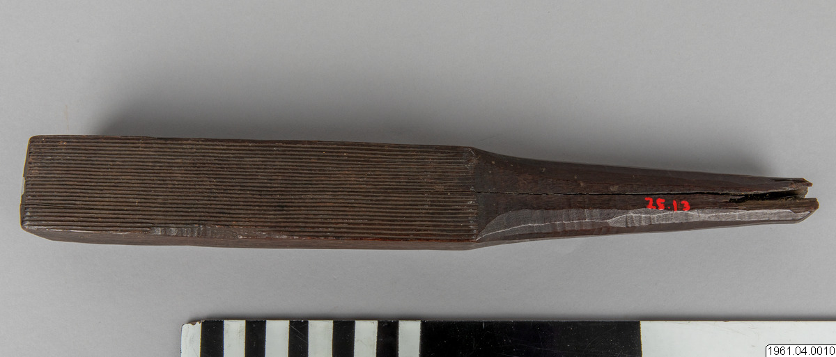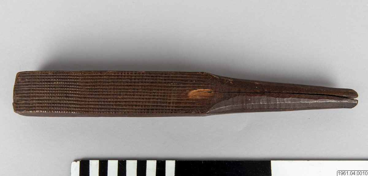 Slagträ för basttygstillverkning. Slagdelen har en kvadratisk sektion. På sidor sitter de längsgående skårorna tätare än på den trdje. Den fjärde sidan har också skåror som går på tvären, korsar de längsgående. Längd: 34,5 cm. Originalnr E 36. 280. Se: P.H. Buck: Arts an crafts of Hawaii. 1957. P. 169 ff