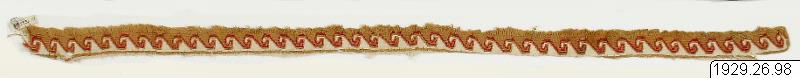 Vävnad (67 x 2,5 cm). Byte från Provinzial-Museum, Hannover. Fragment i kantband i gobelinteknik. Bandet har varit fastsytt vid vit gasväv. Längs nederkanten en frans, vävd på samma gång som på bandet. Varp: 2 tr. S-Z bomullsgarn, vitt, 10/cm. Inslag: 2tr. Z-S bomullsgarn, vitt och 2tr. Z-S ullgarn, rött och ljusbrunt. Fransen i den bruna färgen. M.A Tvättad nov. ...