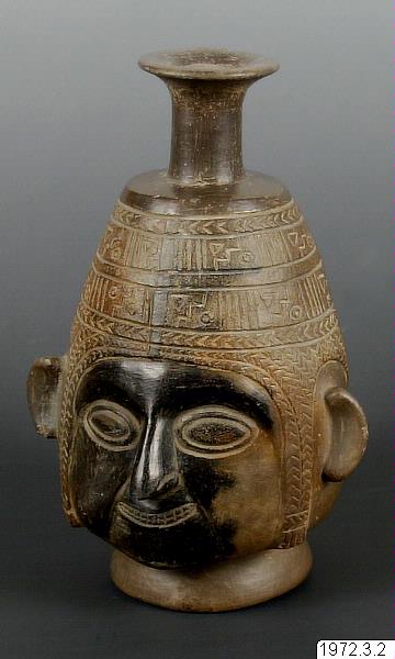 20 cm högt kärl i form av ett människohuvud i svartgodskeramik. Hår eller en form av mössa har utformats med noggranna ornamnentala detaljer. Läpparna och tänderna något snett uppdragna till höger. > Inkaisk kultur i norra Perú. En s.k. huaco. Jfr. denna typ av svartgodshuvuden GEM:s 20.2.26, avbildat och kommenteratt som fig.59A, sid. 125 i Gösta Montell: Dress and Ornaments in Ancient Peru, Göteborg 1929.