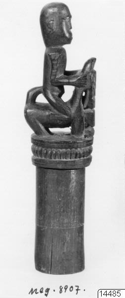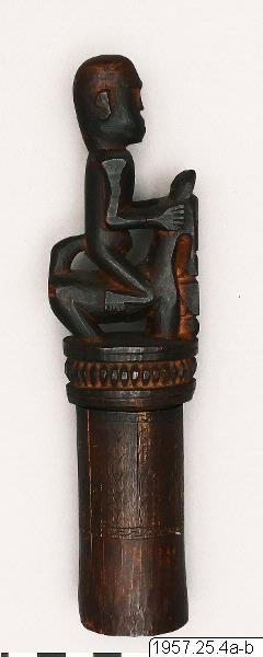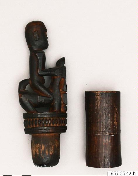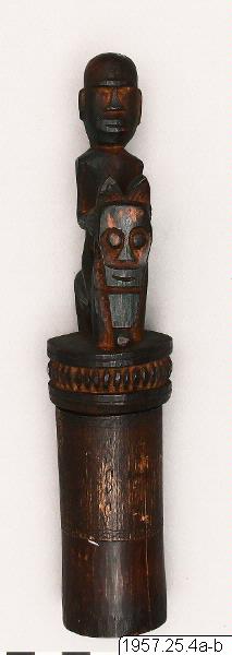 Bambubehållare för magisk materia. Kallas perminaken. Trolldomsformel i batakskrift på behållarens övre del. Locket av trä har formen av en skulptur: en ryttare . Höjd för behållare och lock: 19 cm. Orig. nr 137/631. Kon. Instituut voor de Tropen erhöll föremålet 1921.