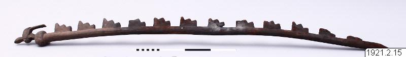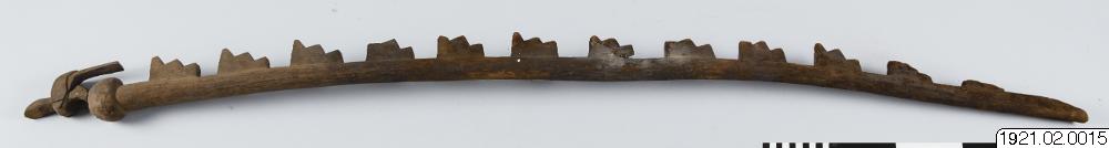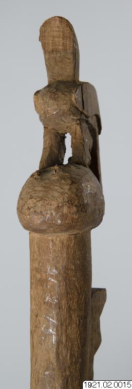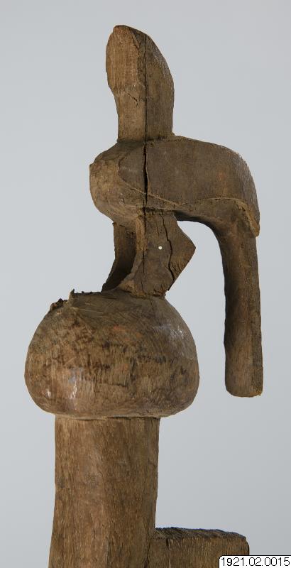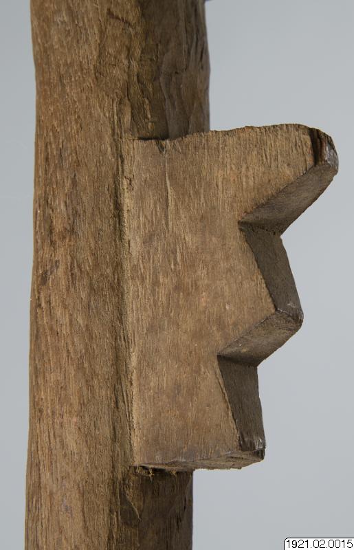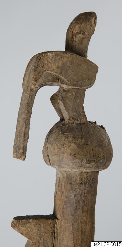 Ceremonial implement with a decorated shaft with blocks of steps as well as a bird on top of the shaft. It is an agricultural implement that had been buried in the dry desert sand in the Ica region and almost certainly is connected to rituals related to agriculture around 900-1450. The blocks of steps design are often seen on these implements and have most certainly a deeper significance than merely as a decorative pattern. Some interpretations associates them with the earth or mountains. They have also been referred to the quechua word chacana, which refers to a bridge, stairs or ladder. In this case chacana is connected to the Orion's belt, and is probably an interpretation of the three stellar appearing as diagonally forming a "staircase". The tool is made of a hard and heavy wood. Through analyses from several of similar wooden implements from the Ica region, they were generally made of the huarango tree, which is one of the world's heaviest hardwoods. Some were made also of an acacia tree, also a very tough wood.