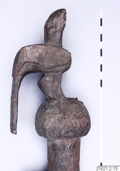 Ceremoniellt redskap med ett dekorerad skaft med trappstegsblock och en fågel som sitter högst upp på skaftet. Redskapet har varit begravt i den torra ökensanden i Ica området och hänger med största sannolikhet hänger samman med ritualer kring jordbruksritualeret omkring 900-1450. Trappstegsmotiv på träredskapen förekom ofta och har förmodligen en djupare betydelse än enbart som dekoration. De kan vara relaterade till jorden eller bergen. De har även förknippats med tquechuaordet "chacana" som betyder bro, trappa eller stege. "Chacana" hänvisade till Orions bälte och är förmodligen en tolkning av att de tre stjärnornas syns som diagonalt formande en ”trappa”. Redskapet är tillverkat av ett hårt och tungt träslag. Genom analyser av flera av liknande träredskap från Ica området tillverkades de vanligtvis av huarango trädet som är ett av världens tyngsta träslag. Vissa tillverkades även av ett acacia träd, även det ett hårt träslag.