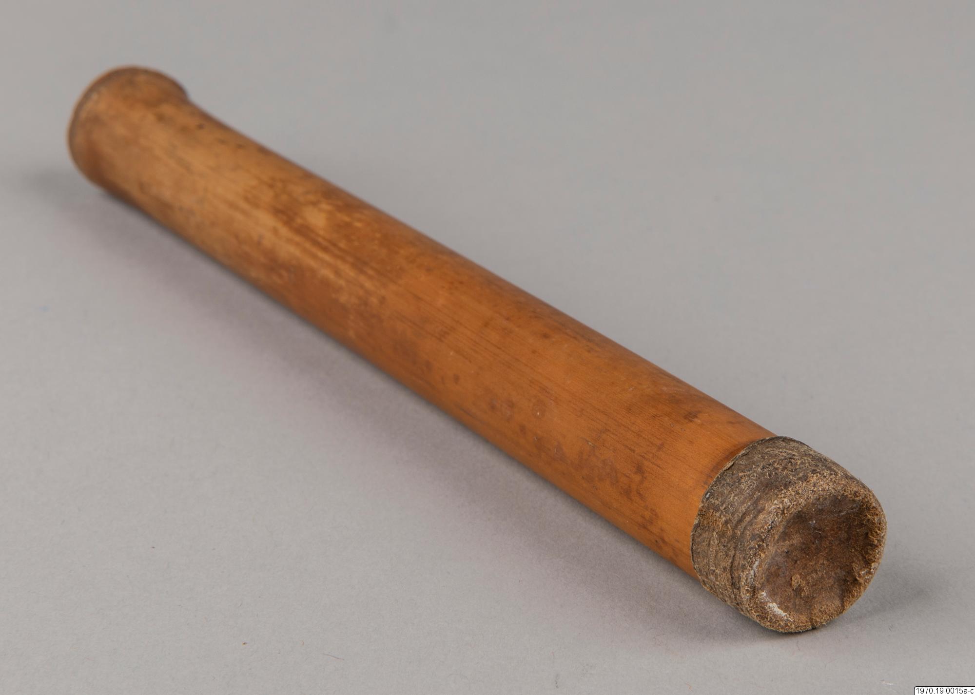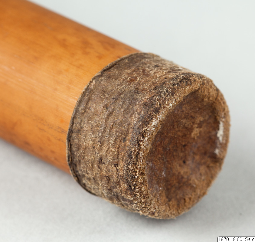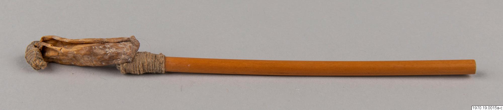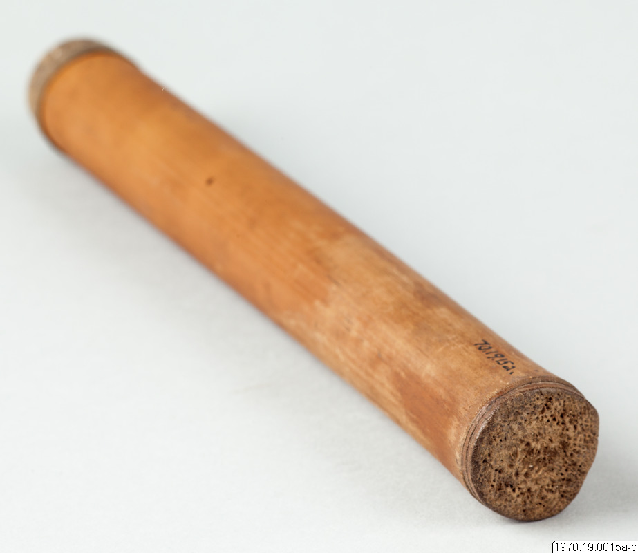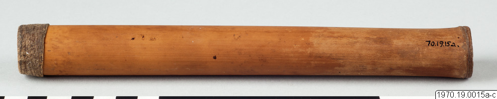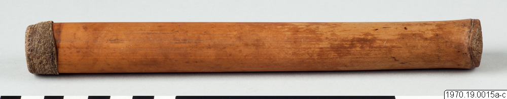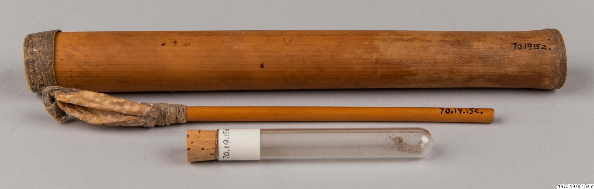 a, 21 cm lång bambubehållare med genomskärning vid mynningen 2,3 cm maximalt. b, lock, 1 cm högt, av skinn, till tuben. c, blåsa av skinn (förtorkat) som sitter surrad vid ett 13,5 cm långt rör av gräs, surrningen av bomullstråd, surrningens bredd 2 cm. En minimal > > mängd av ett pulver (el. förorening) anträffades i tuben men detta naterial 70.19.15d har icke lämnat något positivt resultat vid...