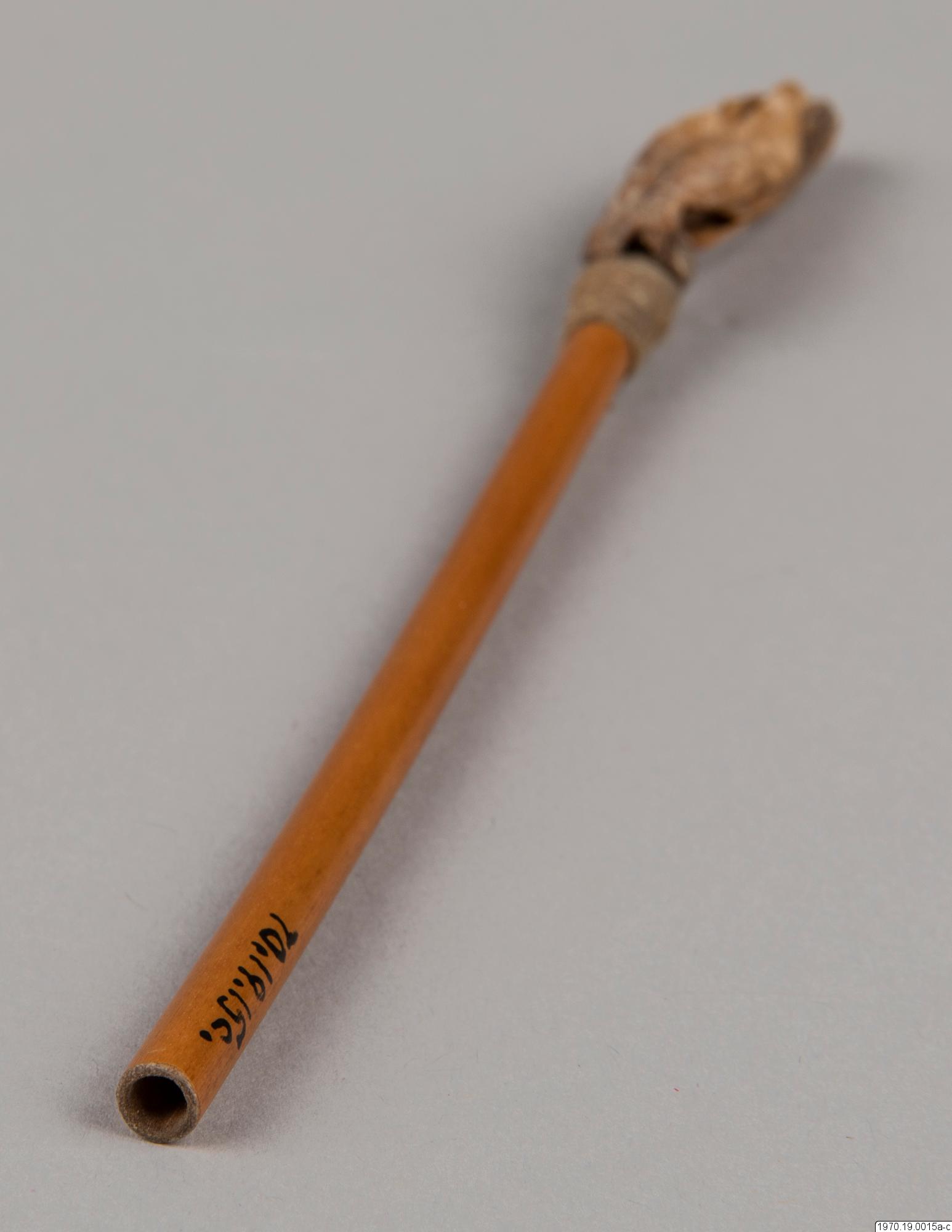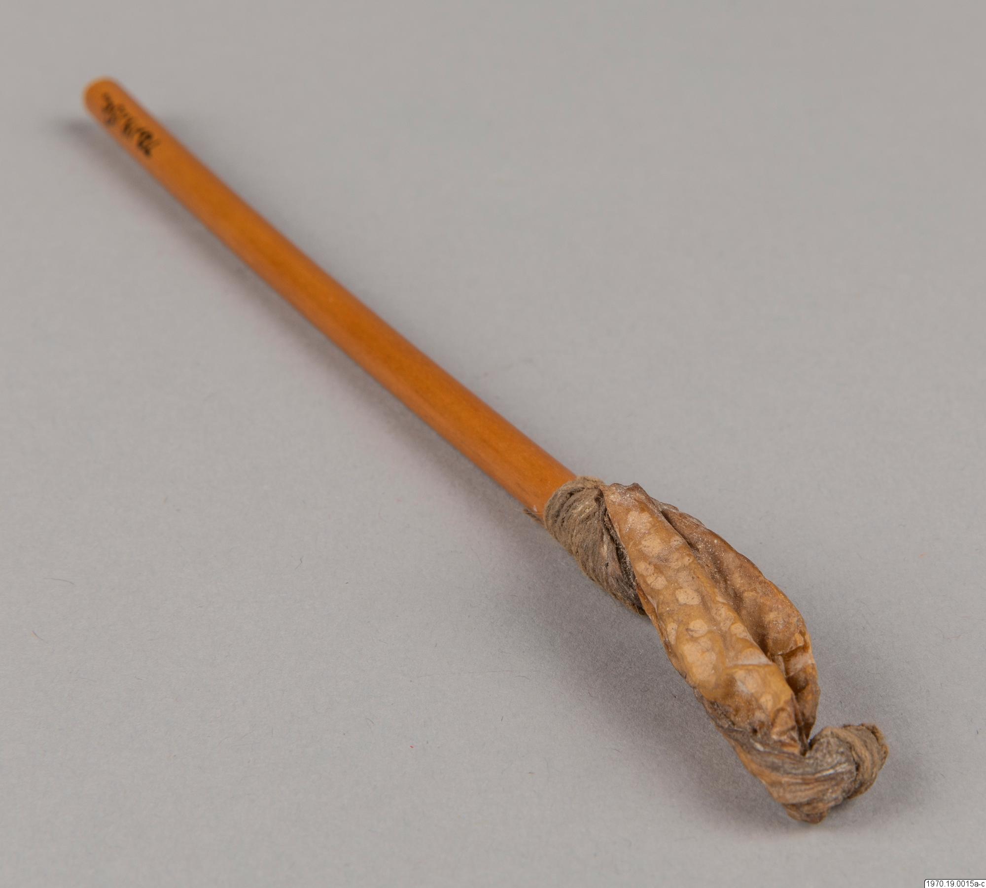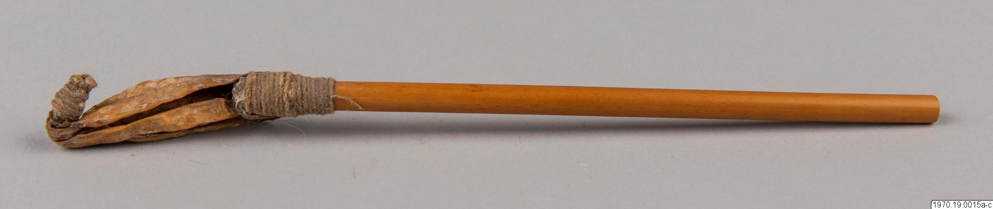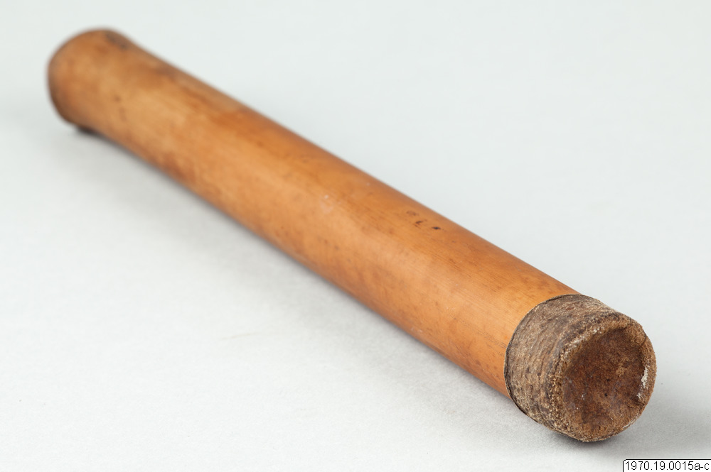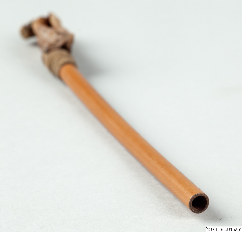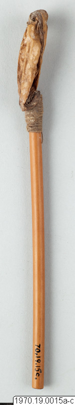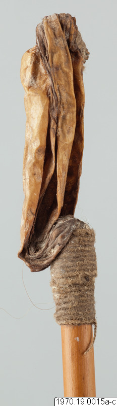 a, 21 cm lång bambubehållare med genomskärning vid mynningen 2,3 cm maximalt. b, lock, 1 cm högt, av skinn, till tuben. c, blåsa av skinn (förtorkat) som sitter surrad vid ett 13,5 cm långt rör av gräs, surrningen av bomullstråd, surrningens bredd 2 cm. En minimal > > mängd av ett pulver (el. förorening) anträffades i tuben men detta naterial 70.19.15d har icke lämnat något positivt resultat vid...