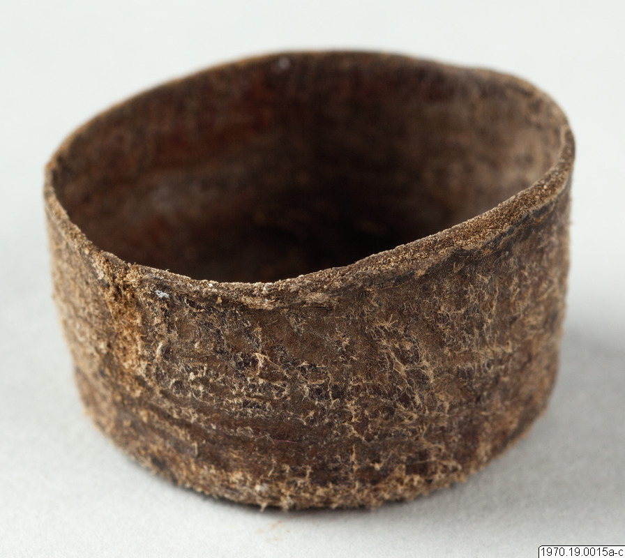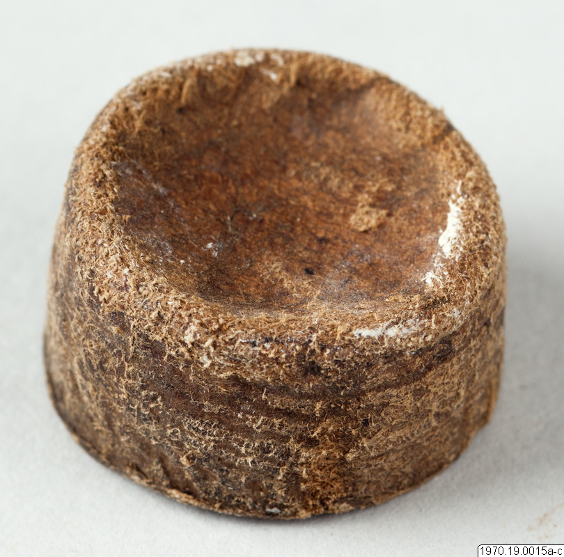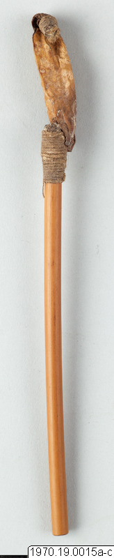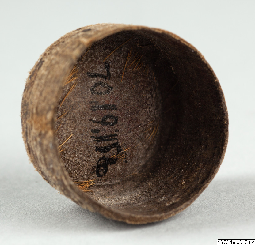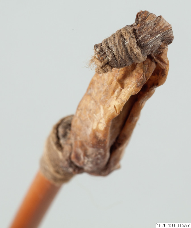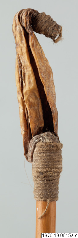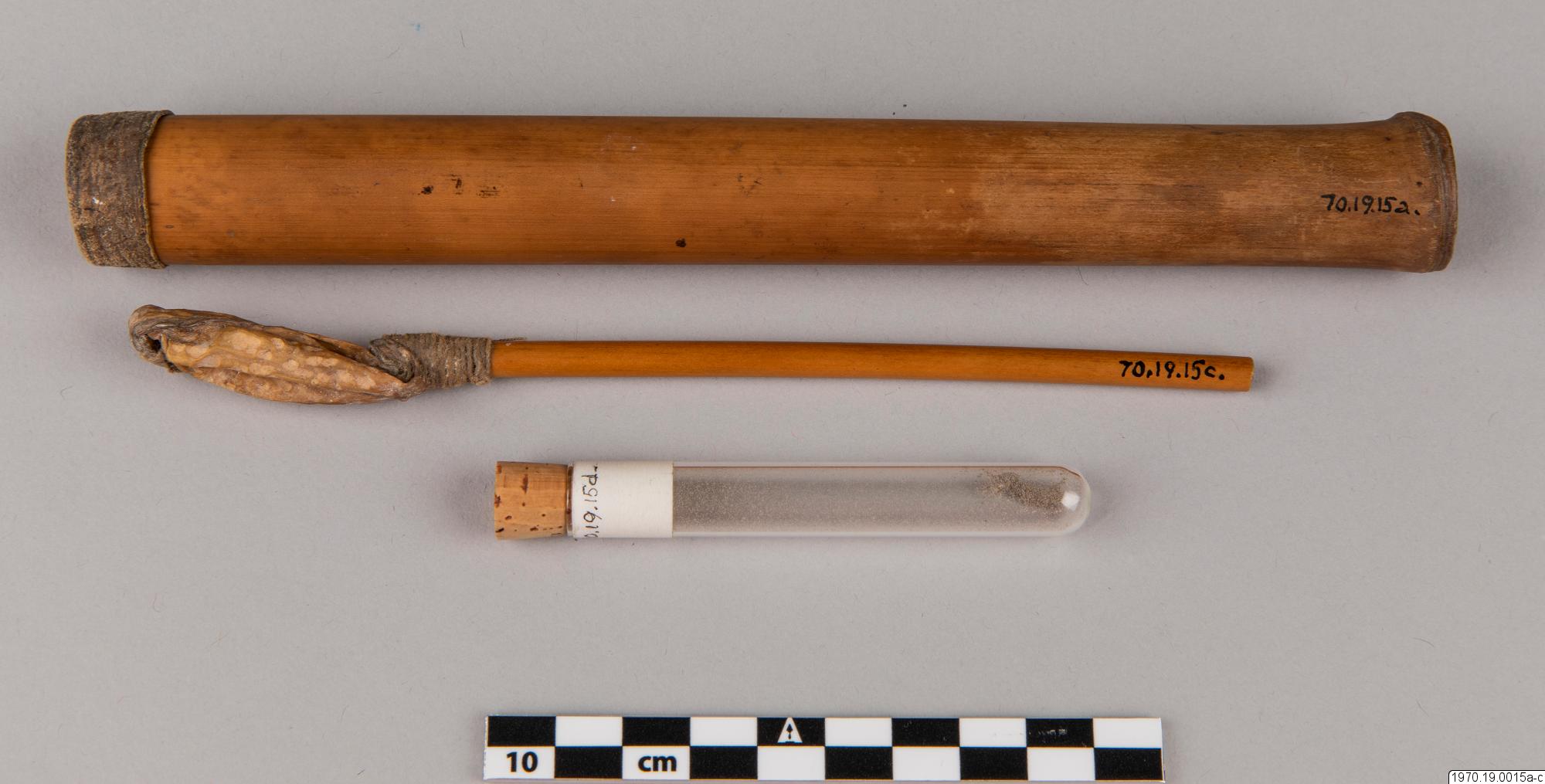 a, 21 cm lång bambubehållare med genomskärning vid mynningen 2,3 cm maximalt. b, lock, 1 cm högt, av skinn, till tuben. c, blåsa av skinn (förtorkat) som sitter surrad vid ett 13,5 cm långt rör av gräs, surrningen av bomullstråd, surrningens bredd 2 cm. En minimal > > mängd av ett pulver (el. förorening) anträffades i tuben men detta naterial 70.19.15d har icke lämnat något positivt resultat vid analys. Blåsan på 15c är nu sprucken (söndertorkad) men skäl finns att tolka instrumentet som en spruta (för lavemang el. d.?). Jfr t.ex. föremålen 5 och 7 i samlingen. Vid inspektion av föremålen på Naturhistoriska Museet den 19.7.1971 har fil. dr. Johannes Lepiksaar för sin del uttalat sig om lcket 15b att det är fråga om tunt skinn från ett däggdjur med enstaka kvarsittande hår. Då dessa sitter inåt har skinneet vänts. Beträffande "blåsan" c menade samme zoolog, att det möjligen kanvara fråga om en bit tarm från ett djur. Detta hellre än en urinblåsa.