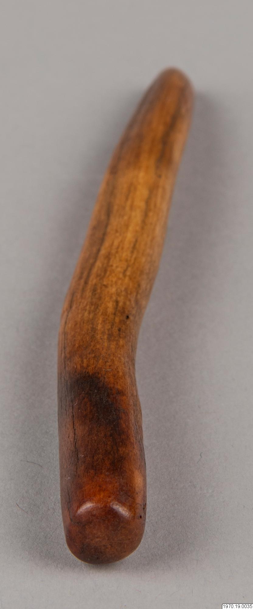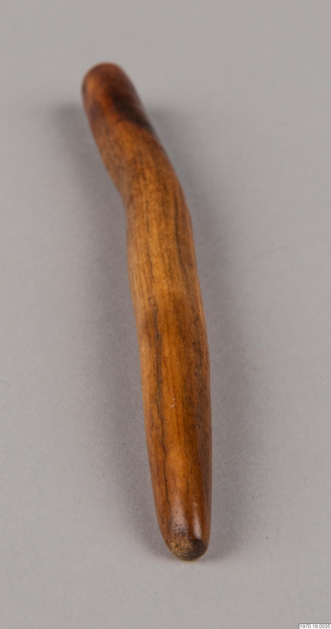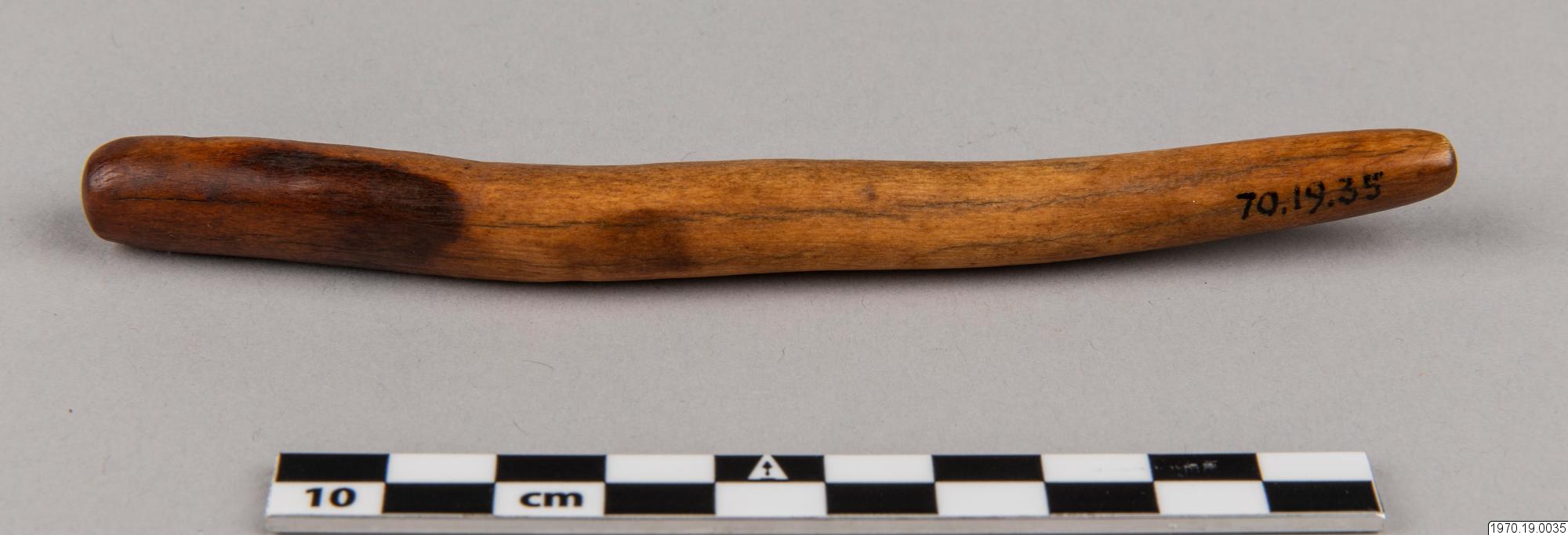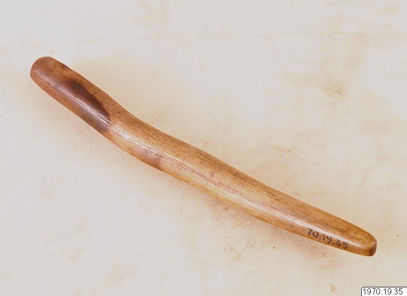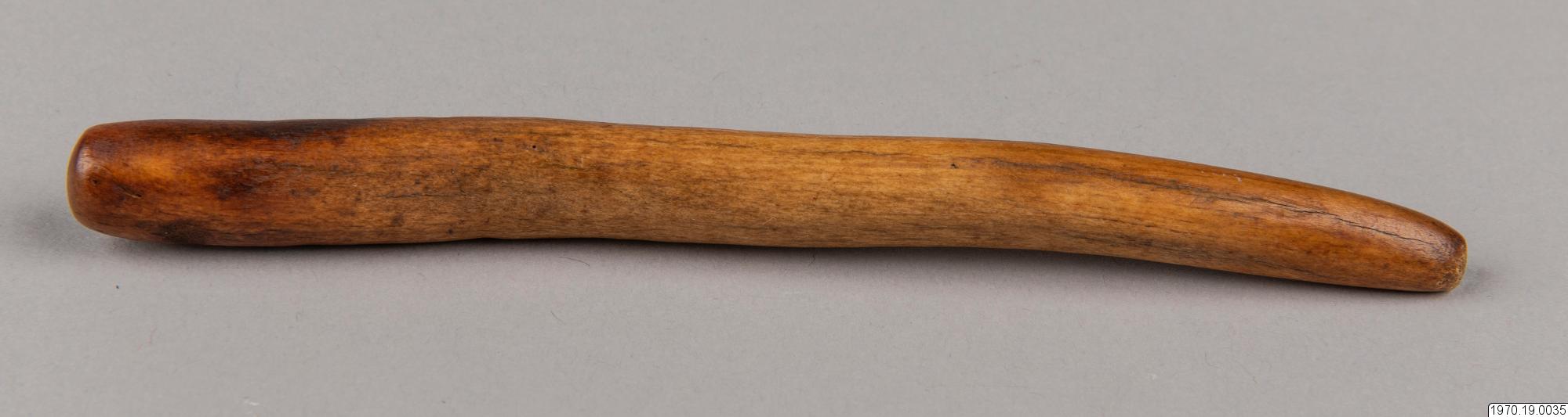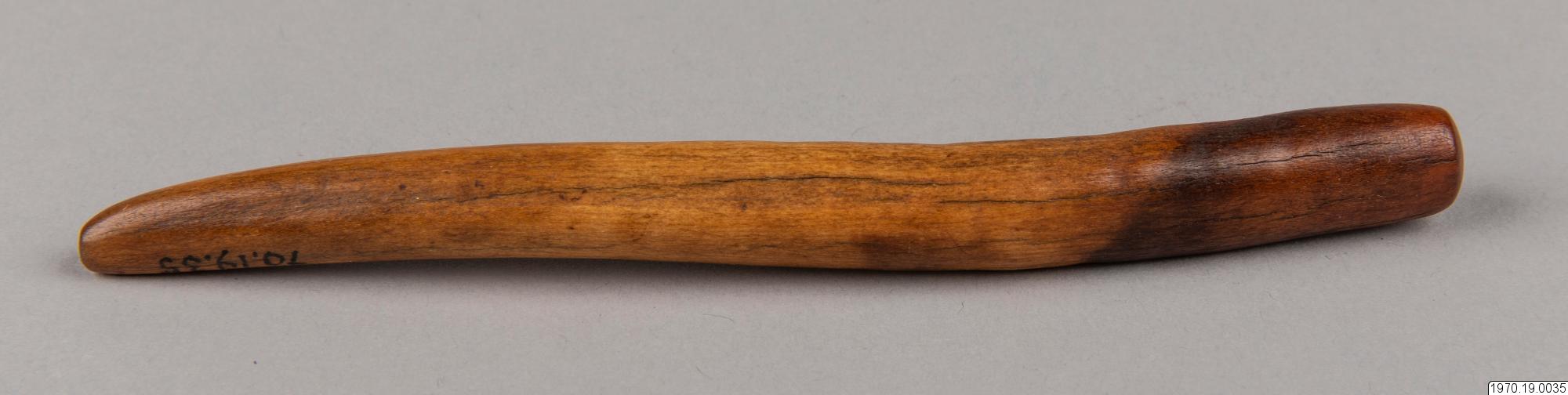 13,8 cm långt föremål av ben, diam. ca 1 cm, något ojämt böjt. Troligen en mortelstöt. Benföremålet är i tjockaste delen mörkare färgat än den övriga ytan. > EXOTICA 1973