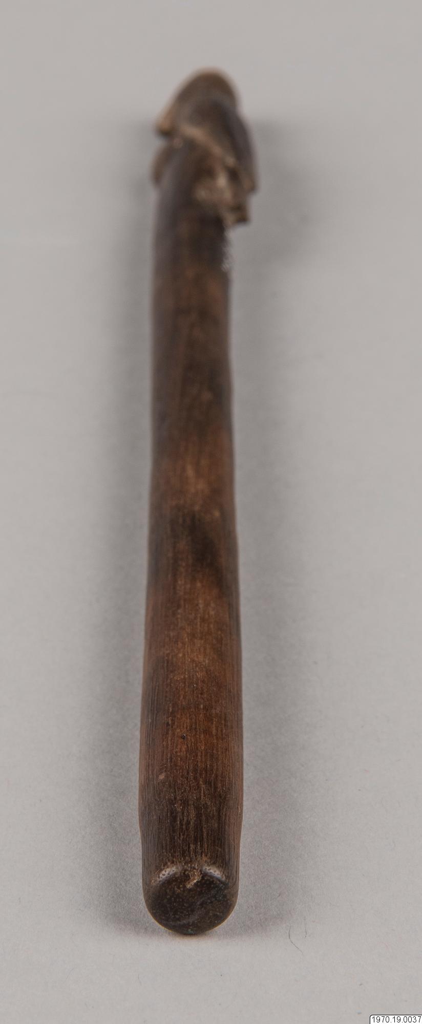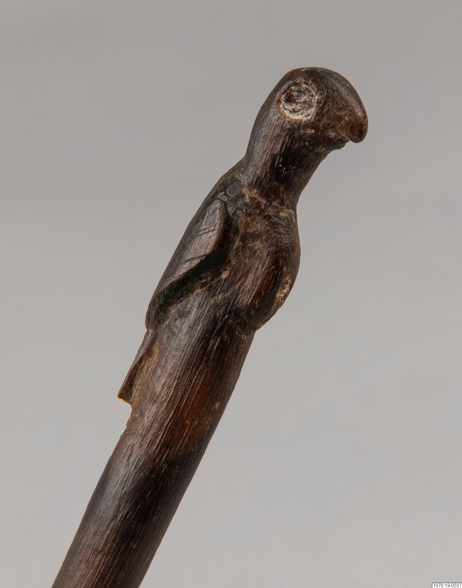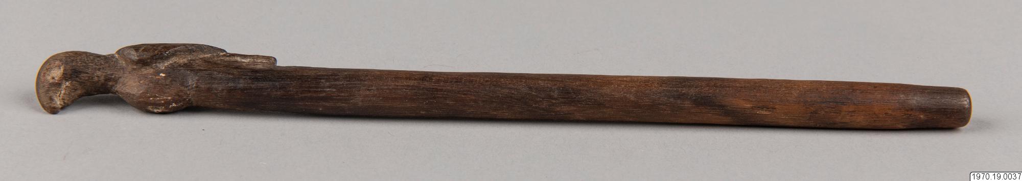 21,5 cm lång pinne av trä, mortelstöt el.d. ? Överst försedd med en skulpterad papegoja, som mjölöigen haft inläggningar i ögonen. Mörkt träslag. EXOTICA 1973
