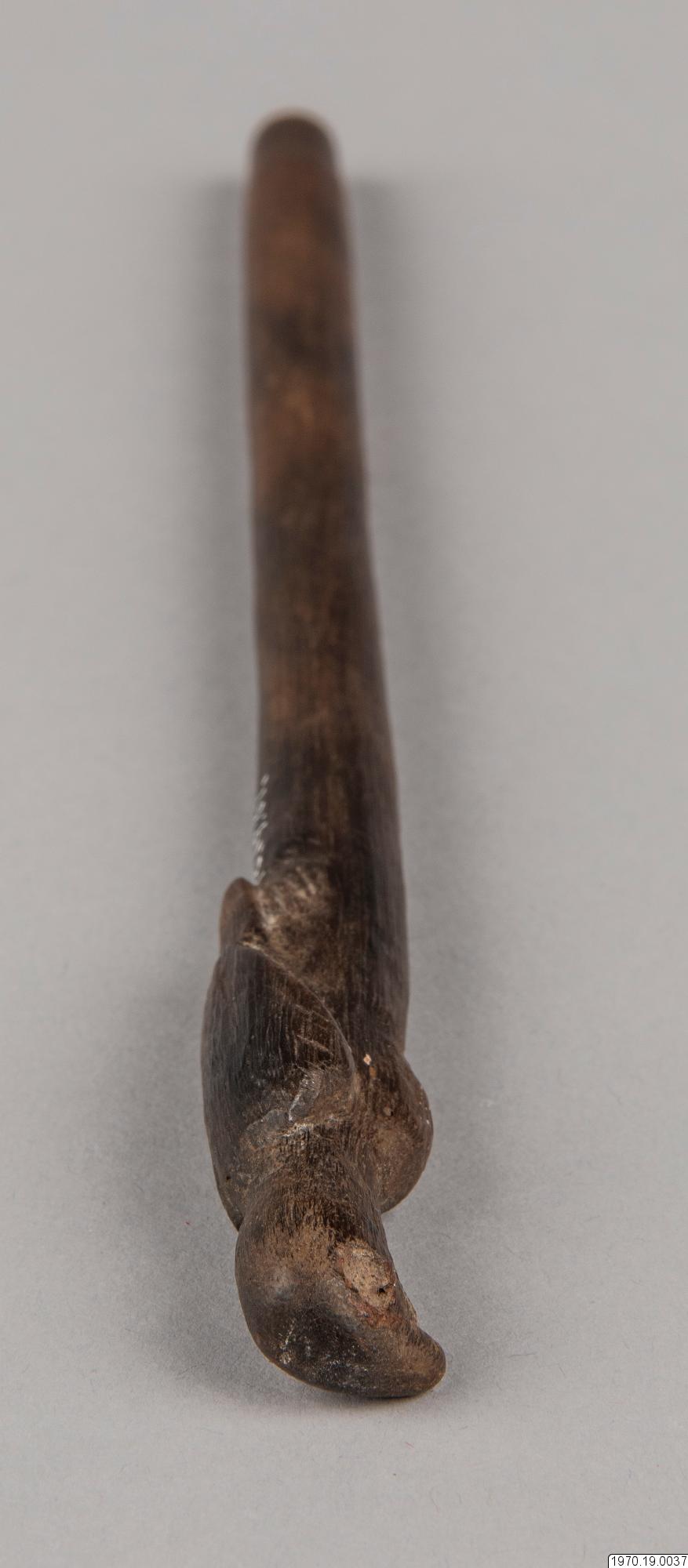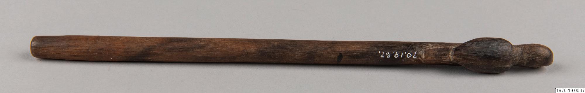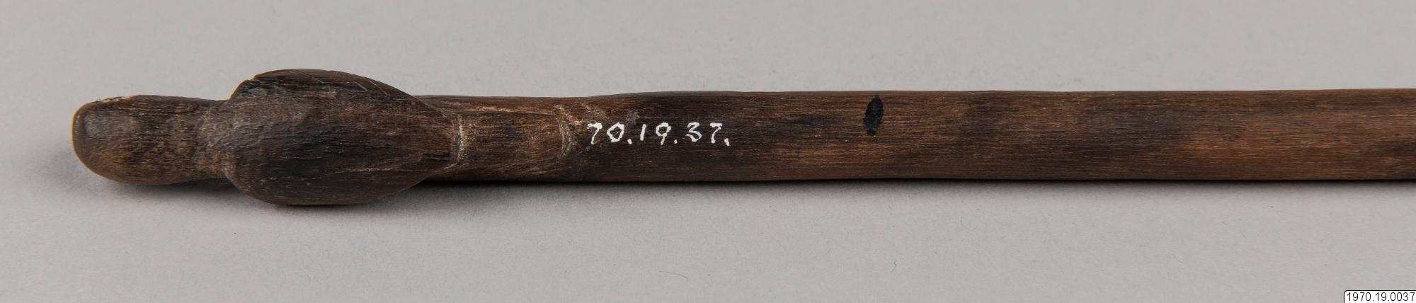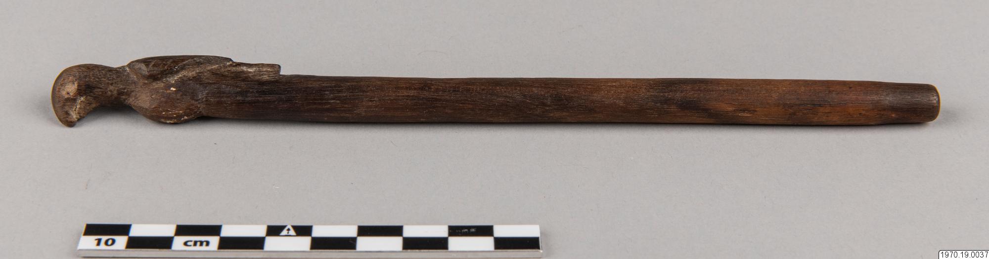 21,5 cm lång pinne av trä, mortelstöt el.d. ? Överst försedd med en skulpterad papegoja, som mjölöigen haft inläggningar i ögonen. Mörkt träslag. EXOTICA 1973
