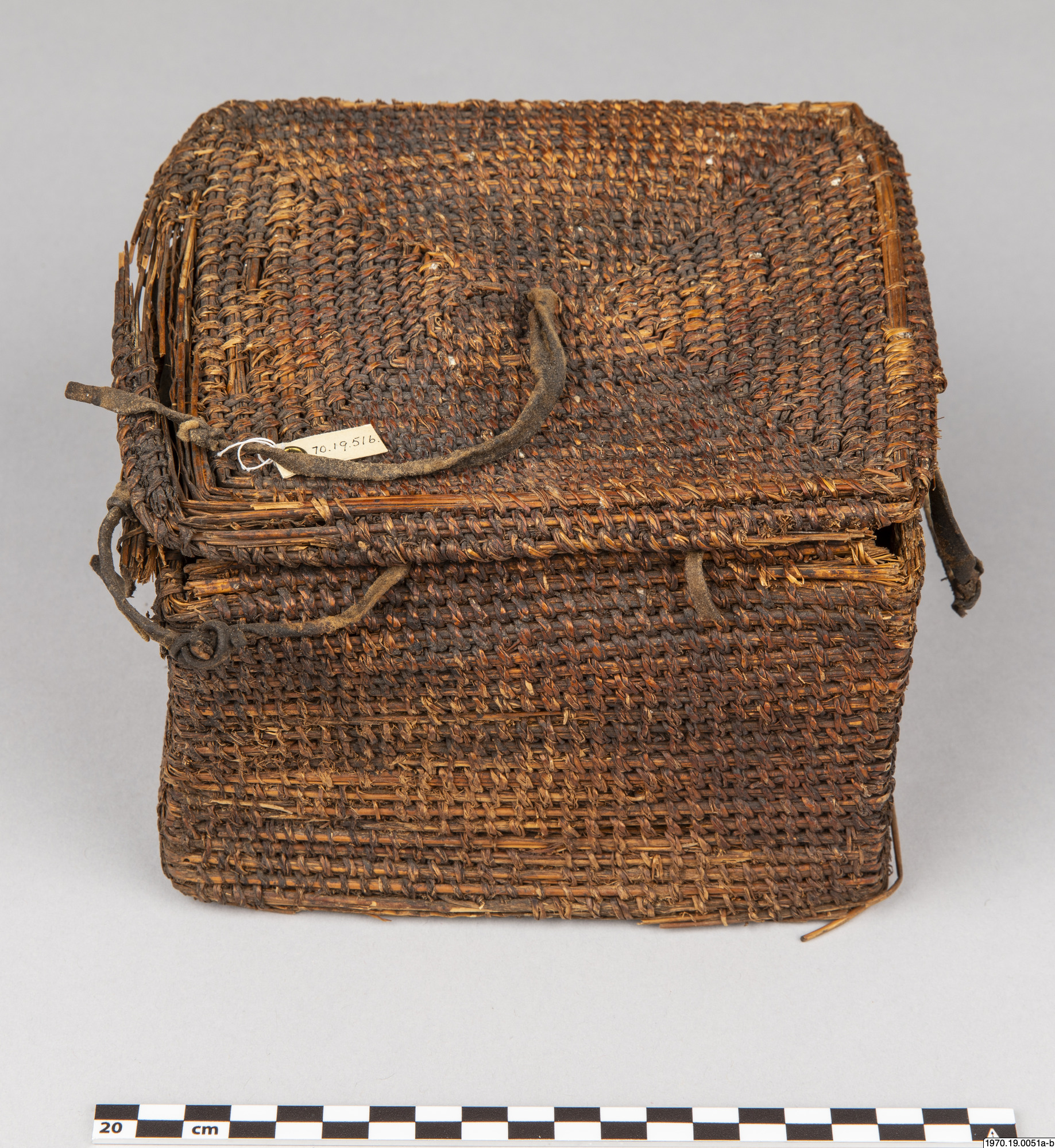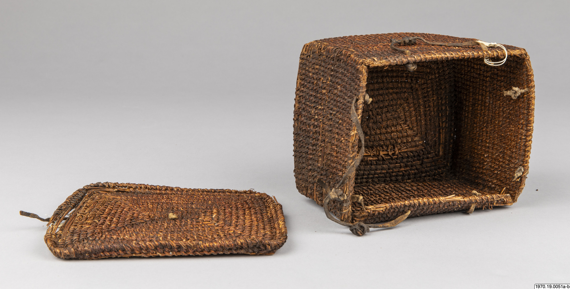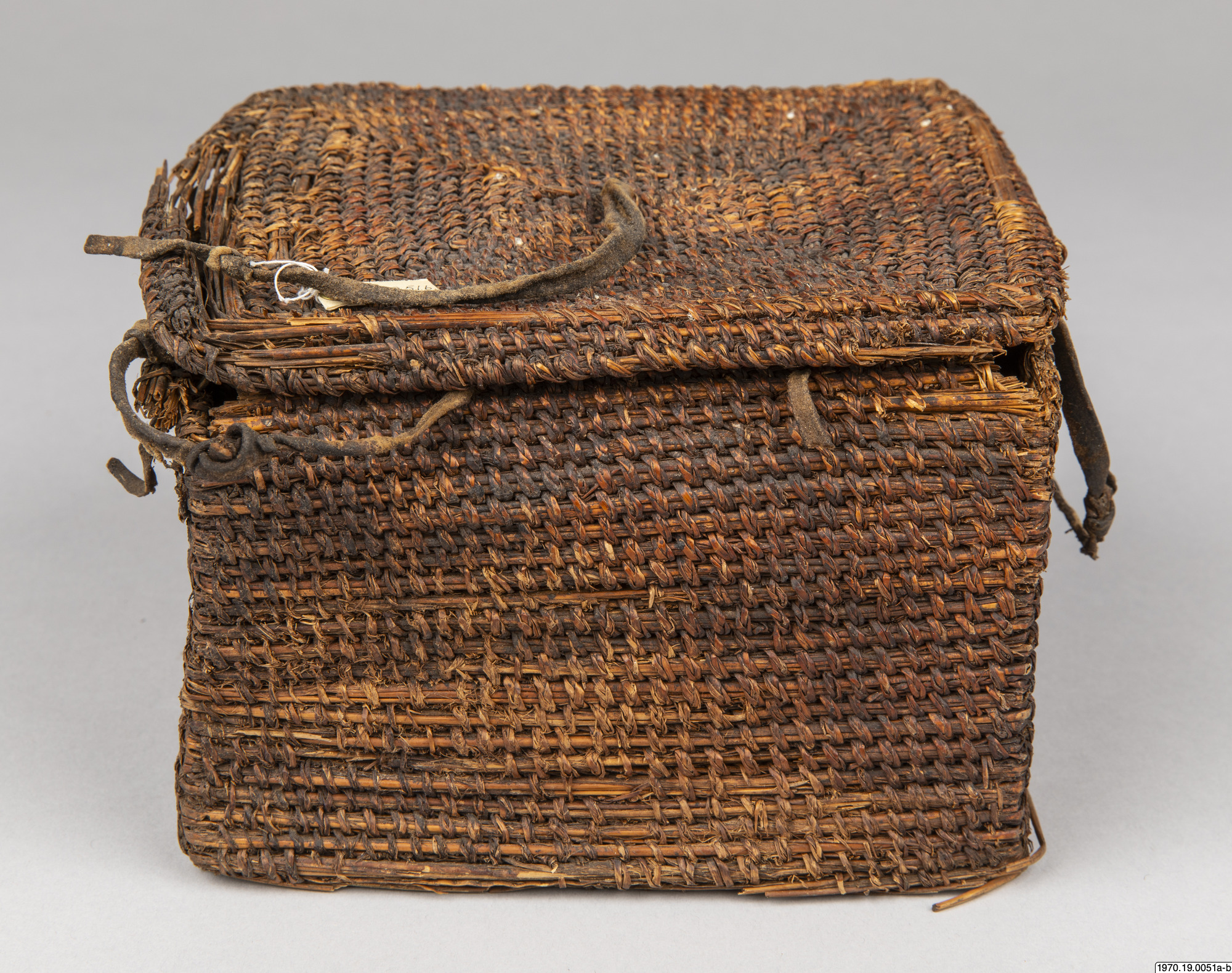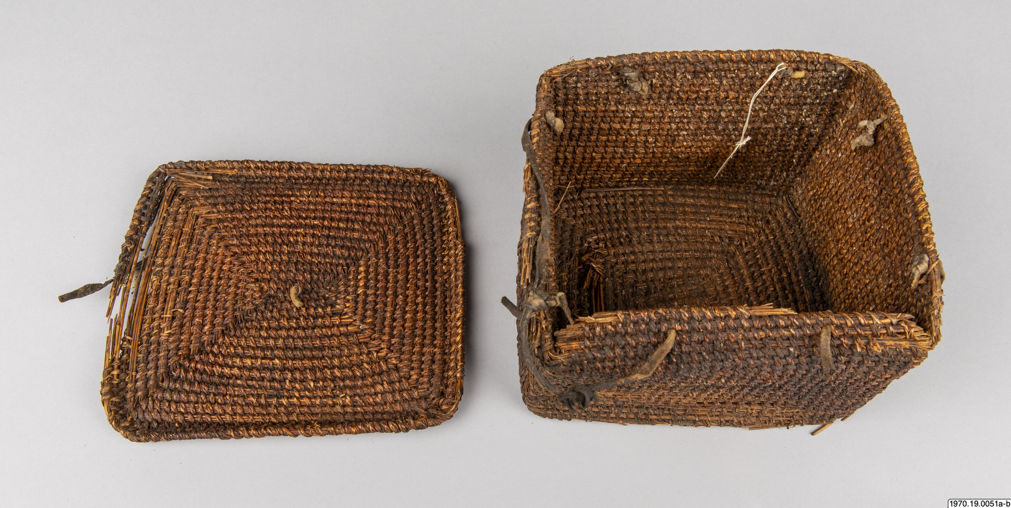 Fyrkantig korg (a) med lock (b). Höjd 14 cm, längd 15,5-16,5 cm, bredd 13,5-14 cm för korgen. Locket 1x16x14-14,5 cm. På lockets mitt en lädersnodd som är 16 cm lång fäst med en knut på insidan av locket. Även lädersnoddar eller fragment av sådana på sidorna av > > korgen. Flätning av gräsfibrer, tekniken coiled varav beskrivning kommer att lämnas i den totala beskrivningen av fyndet i Etnologisk...