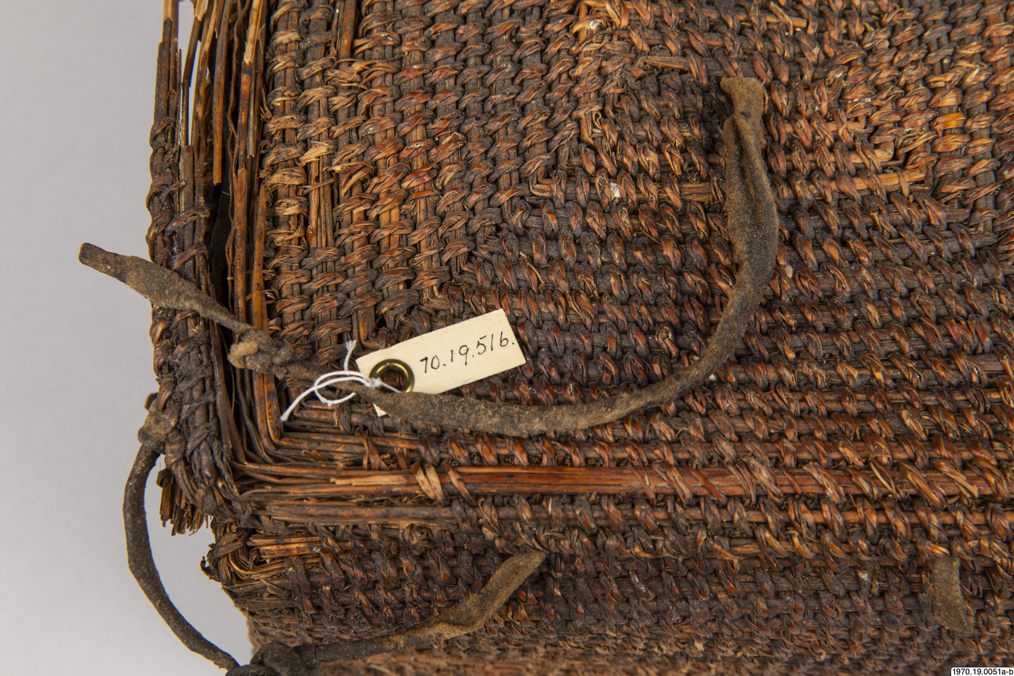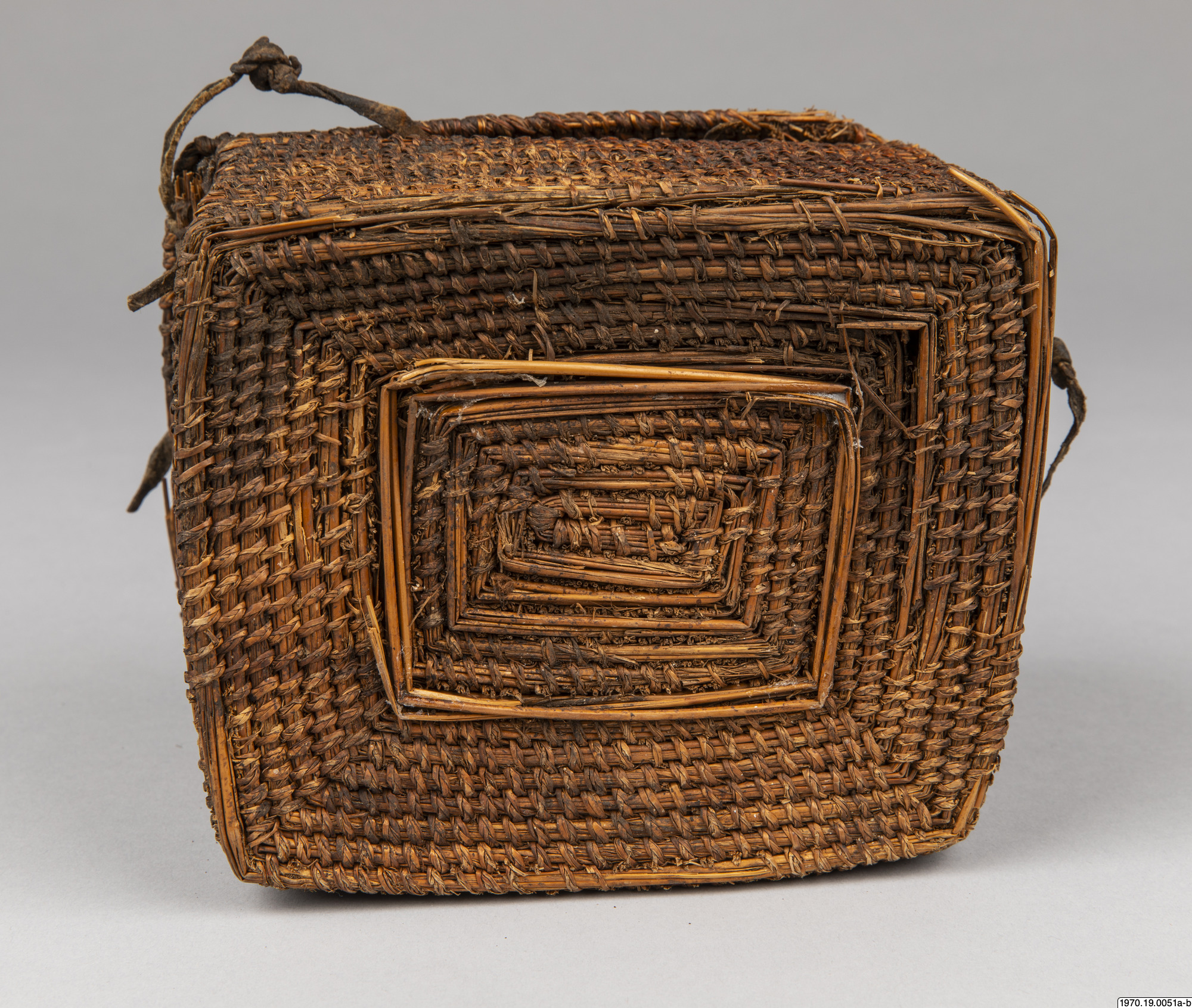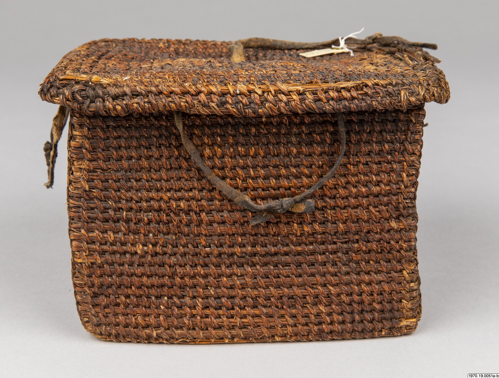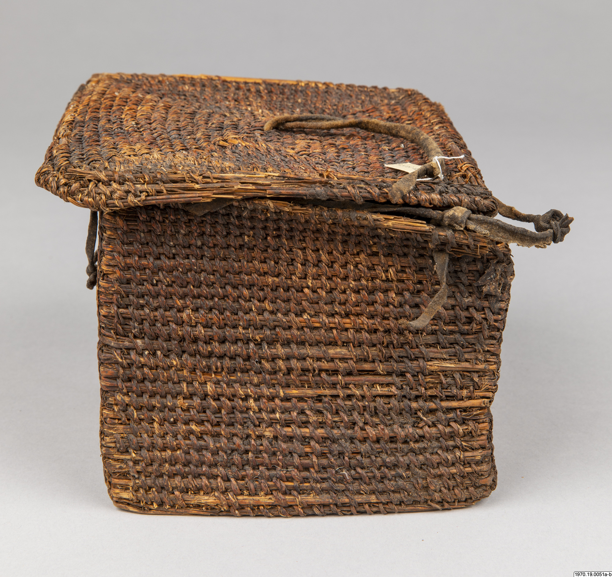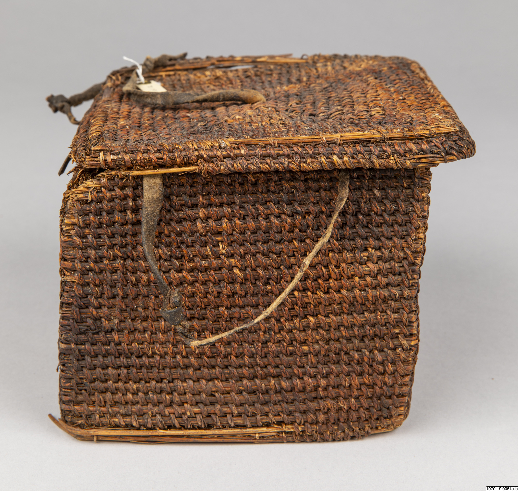 Fyrkantig korg (a) med lock (b). Höjd 14 cm, längd 15,5-16,5 cm, bredd 13,5-14 cm för korgen. Locket 1x16x14-14,5 cm. På lockets mitt en lädersnodd som är 16 cm lång fäst med en knut på insidan av locket. Även lädersnoddar eller fragment av sådana på sidorna av > > korgen. Flätning av gräsfibrer, tekniken coiled varav beskrivning kommer att lämnas i den totala beskrivningen av fyndet i Etnologisk...