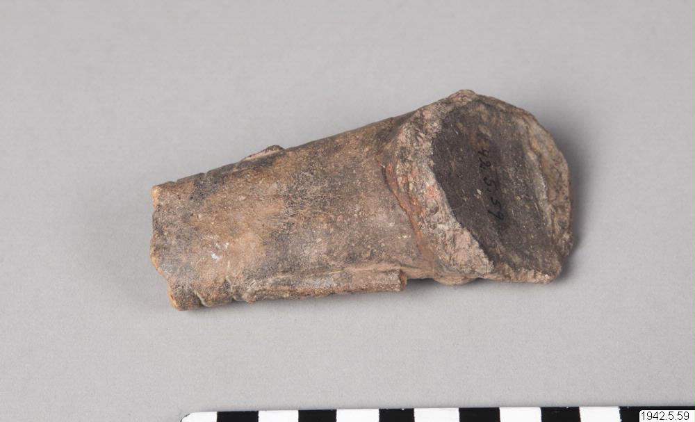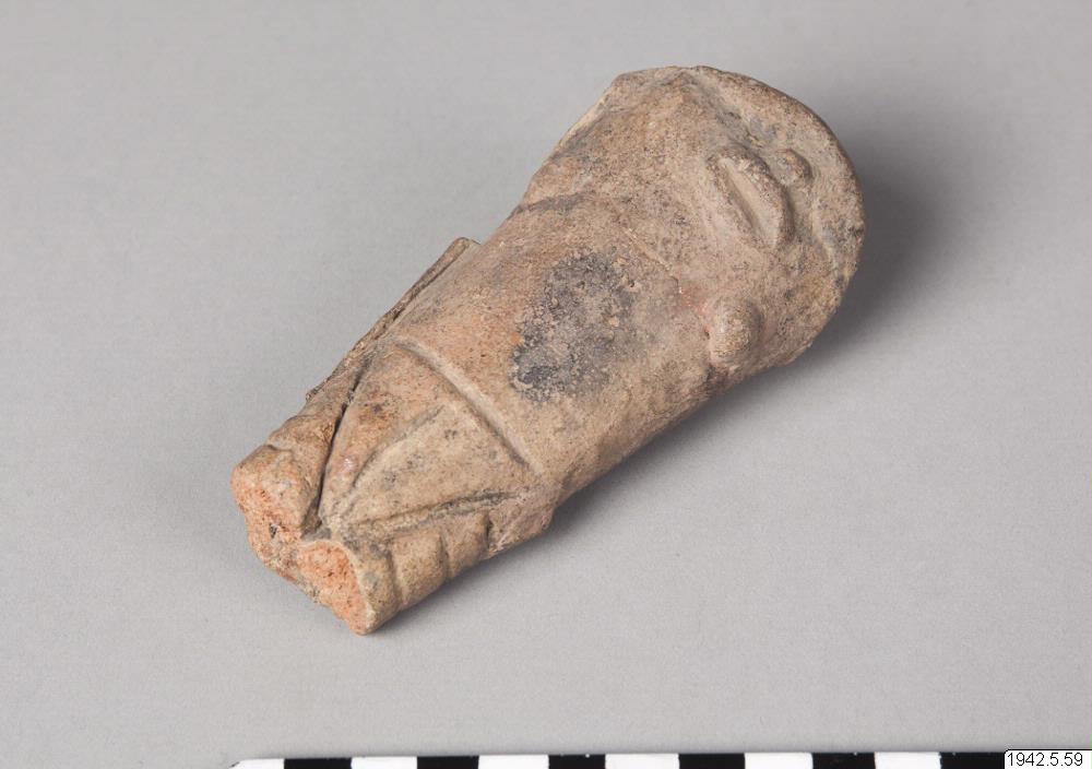• Antropomorf lerkärlsfot. Gåva till samlaren. Till samma kärl hörde foten 42.5.60 och en eller två till.
