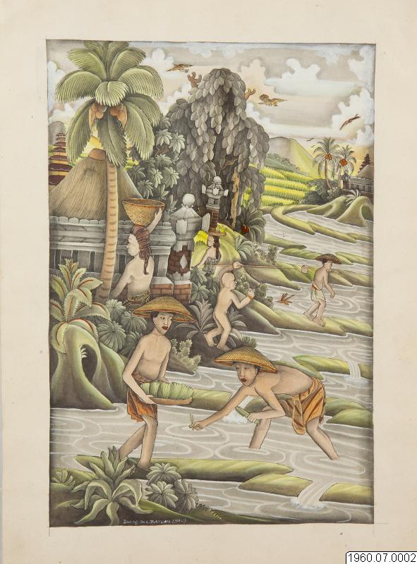 Akvarell föreställande omplantering av ris. Signerad: Dw. Nj. Oka 37,3 x 37,6 cm. (katalogkort/originalbeskrivning)