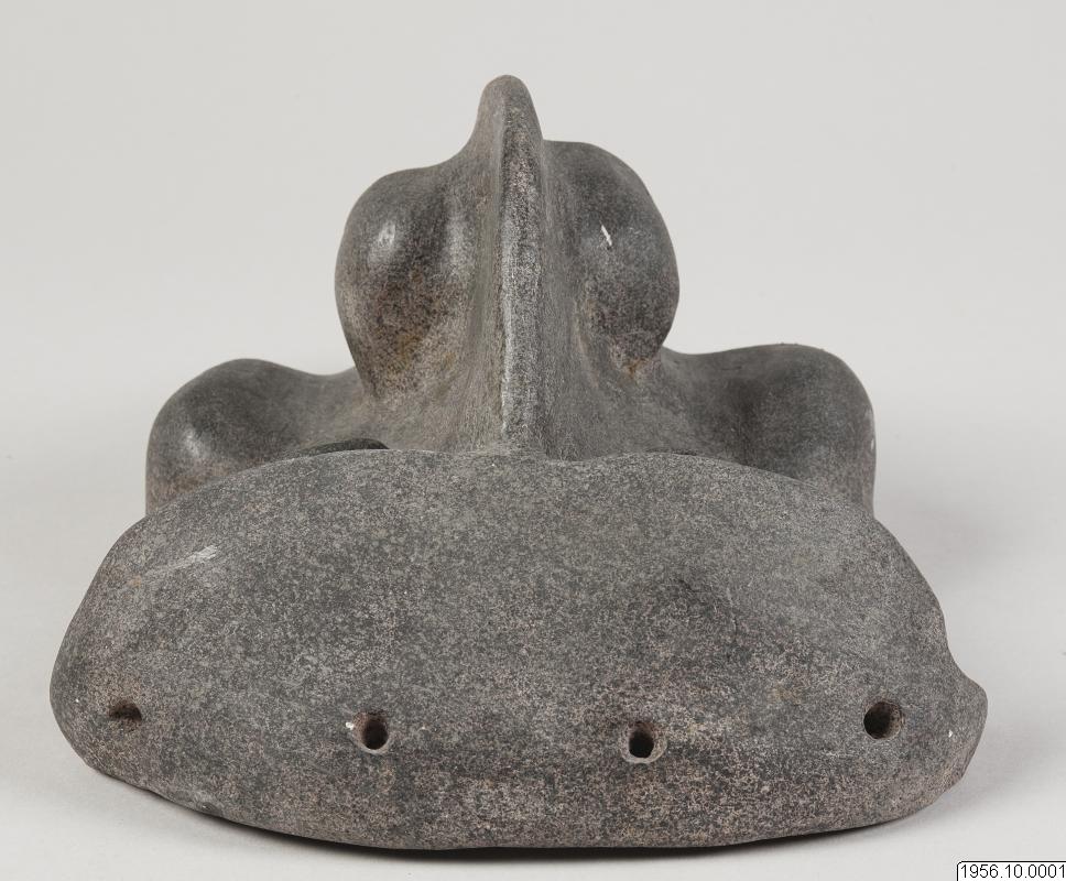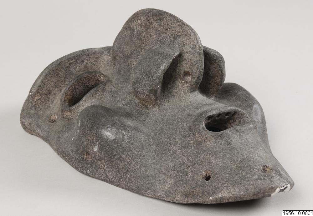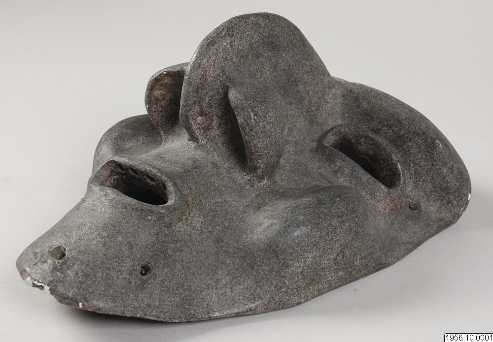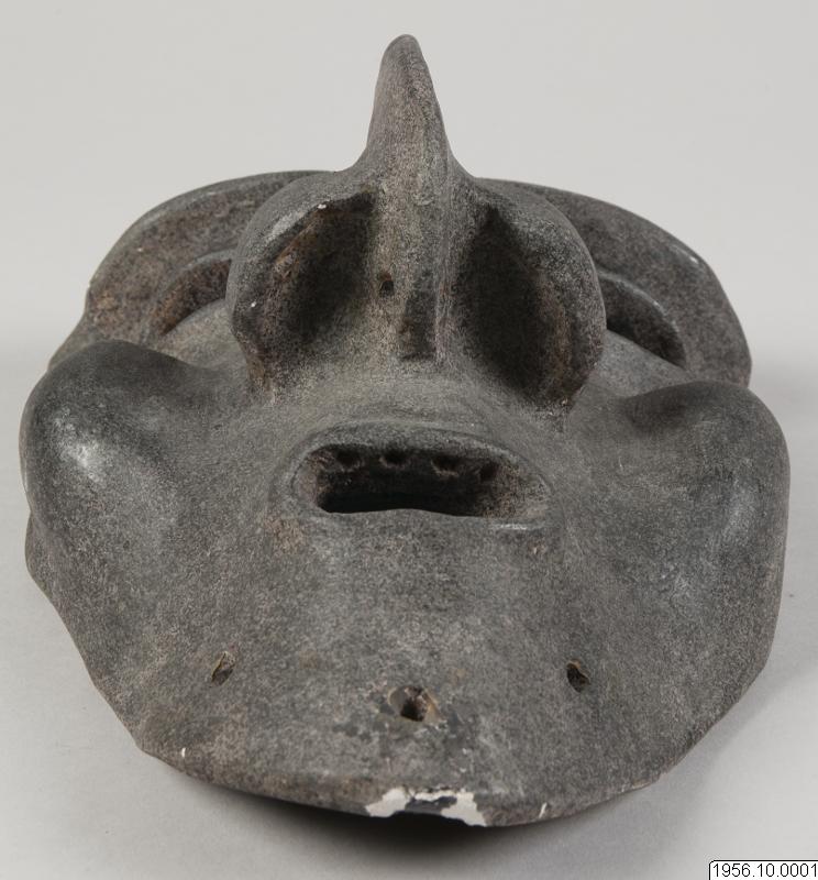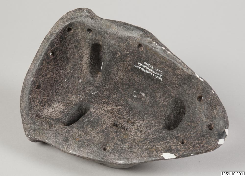 Avgjutning i gips av ansiktsmask, 30 cm hög. Mycket kraftig näsa och näsvingar, antagligen gm bruket att i dessa bära guld- eller tumbagaprydnader. Masken har flera upphäningshål, varav tre under munnen på hakspetsen, i underläppen har fyra hål markerats. Avgjutningens storlek skall motsvara originalets. Originalet är gjort av finpolerat mörkbrun lera. Enligt uppgift av Dr. Gerardo Reichel-Dolmatoff (Cartagena) till Henry Wasén i brev av den 25/4 1956 (finns i korrespond- ensen) skulle originalmasken ha funnits eller köpts av colombianske arkeologien Cubillos (från år 1955 i Popayán) i Río Blanco, Dep. Tolima. Enligt Reichels personliga uppfattning finns inget bevis för att masken skulle vara från Pijao-stammen, som anses vid Instituto Colombiano de Antropología i Bogotá där avgjutningen gjordes 1955 på beställning och betalning av intendent Henry Wassén vid vistelse på institutet.