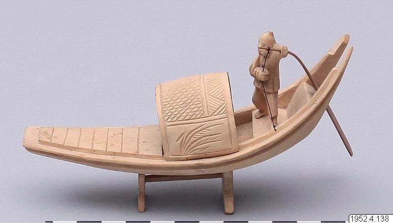 • 14,5 cm lång modell i ljust trä. Man som med styråra styr en flodfarkost.