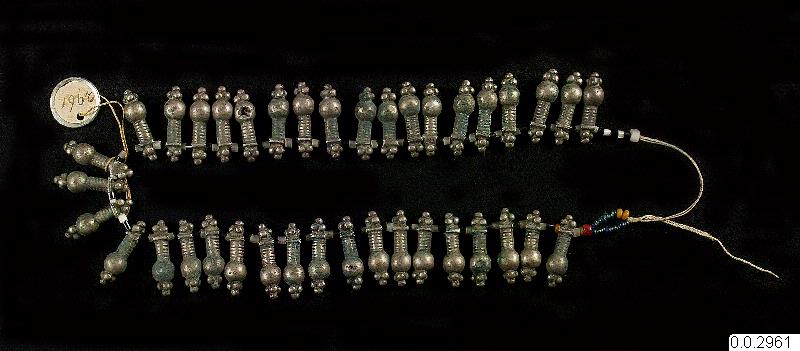 Bröstsmycke för brudar och trolovade. Gåva. Längd: 22 cm, Bredd: 10 cm, Tjocklek: 1 cm. Ursprung: Etiopien (Nord-Abessinien, eller närliggande område enl. kort) Breast-jewellery for brides and engaged. Gift. Length: 22 cm, Width: 10 cm, Thickness: 1 cm. Origin: Ethiopia (North-Abessinia, or adjacent area according to card) (utställningstext, Horisonter - röster från ett globalt Afrika).