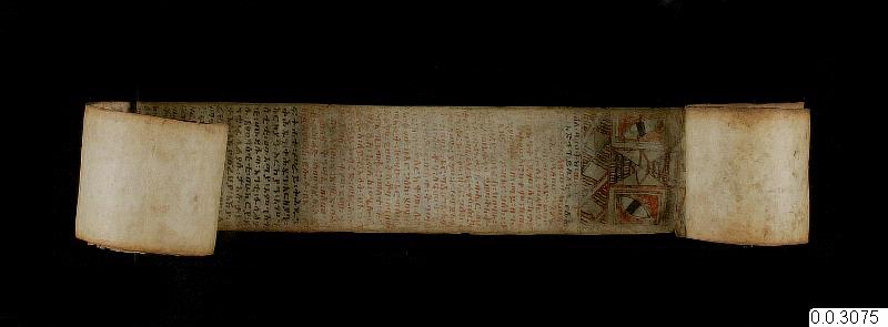 Pergament. (användes som skydd mot onda andar / sjukdom) Längd: 135 cm. Ursprung: Etiopien (Nord-Abessinien, eller närliggande område enl kort) Parchment. (used as protection against evil spirits / diseases) Length: 135 cm. Origin: Ethiopia (North-Abessinia, or adjacent area according to card) (utställningstext, Horisonter - röster från ett globalt Afrika)