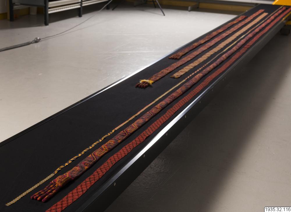 Provband 1935.32.0116 Bandet har 14 olika mönsterenheter och var och en av dem är 50 cm långa. Bandet har en rad med limabönor, resten av mönstren är olika geometriska former. Material och teknik Gobelängväv med varp i bomull och inslag i ull. Datering och ursprung Paracas Nekropolis, Intermedio Temprano 2 (ca 100 e.kr – 200 e.kr)