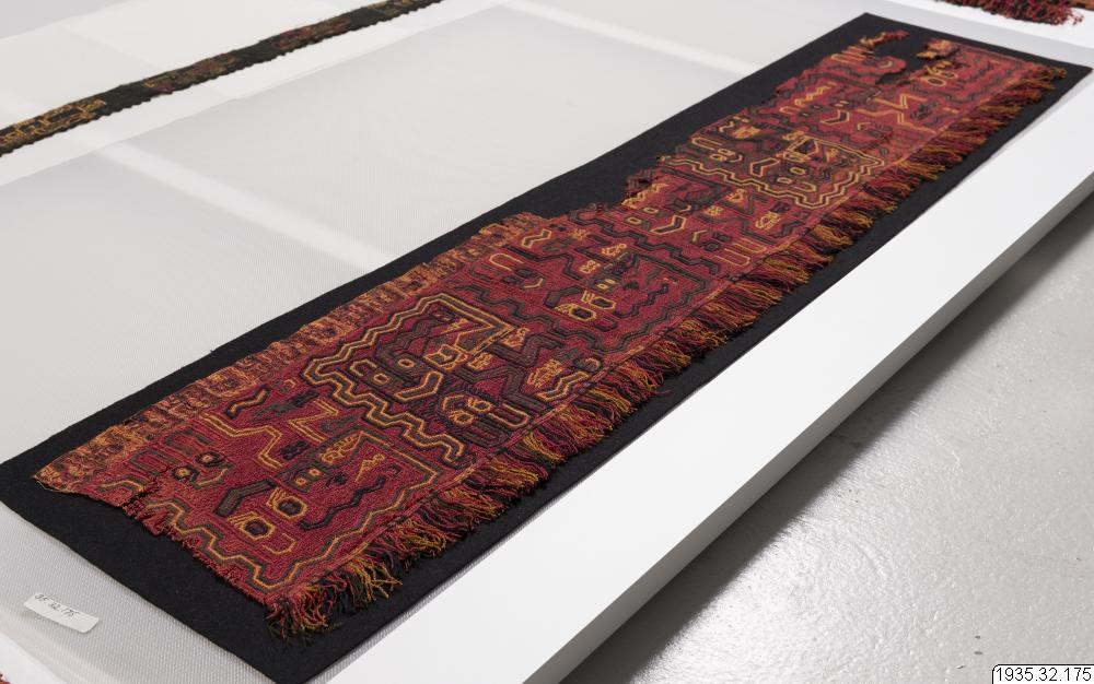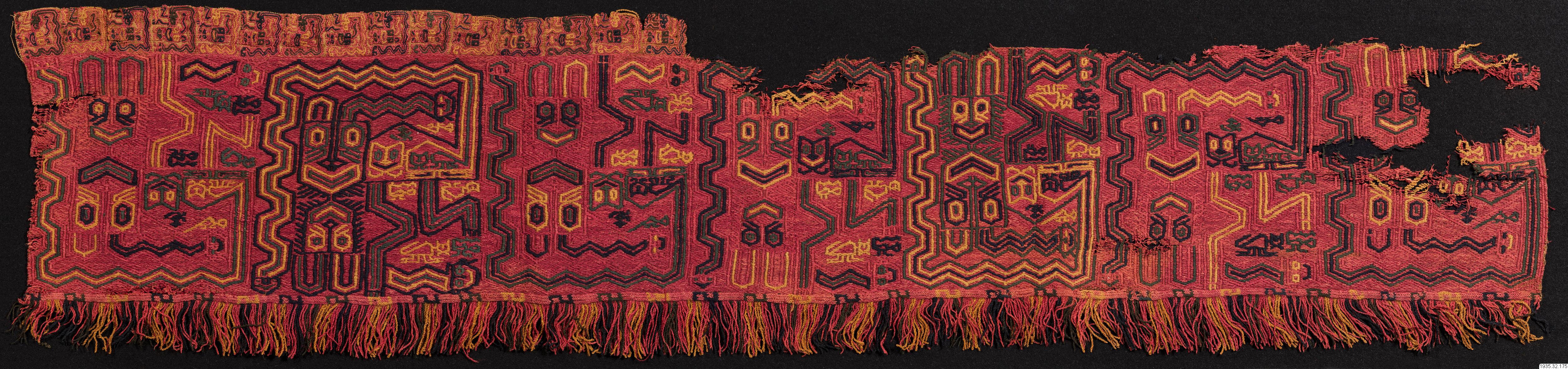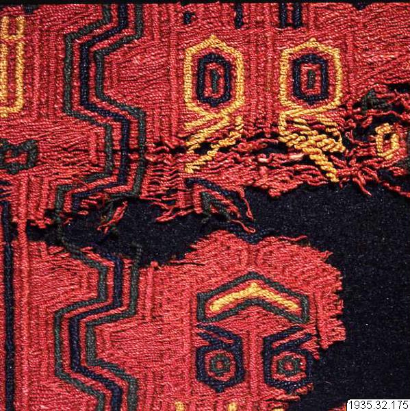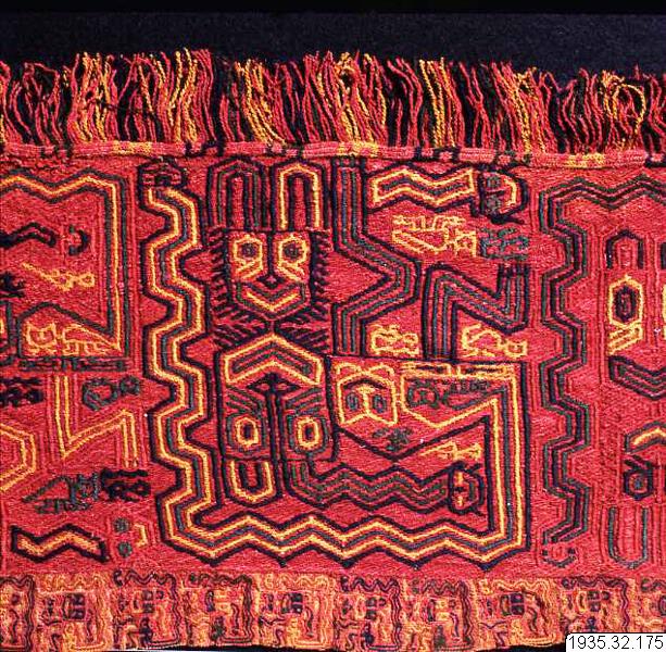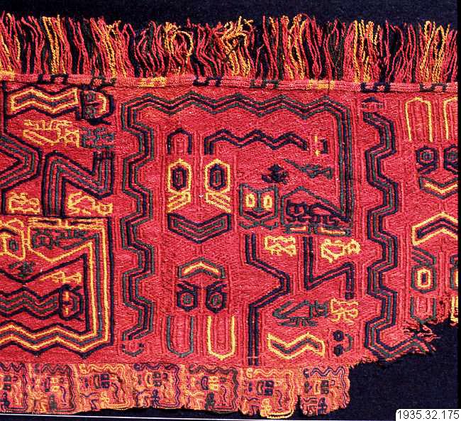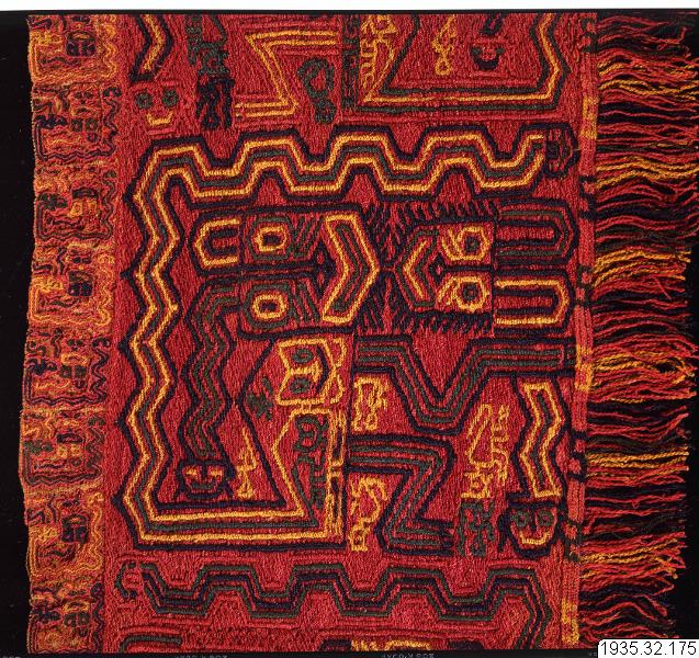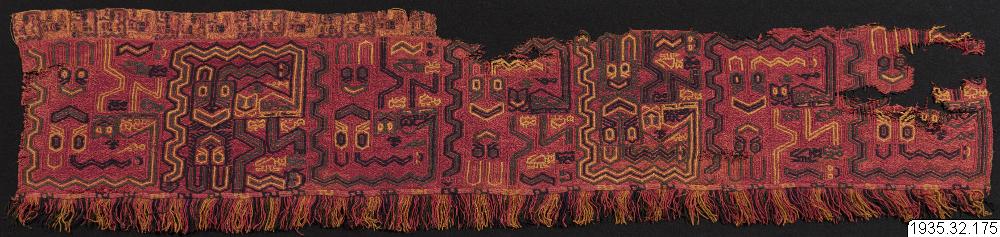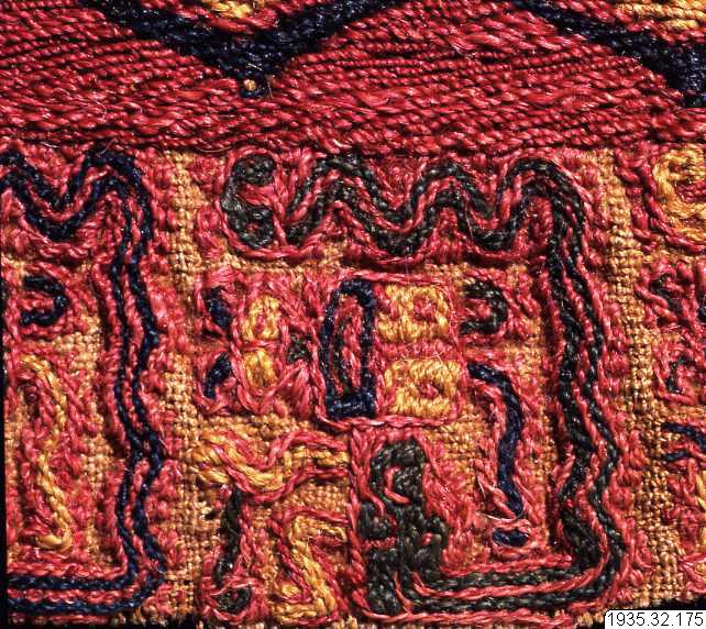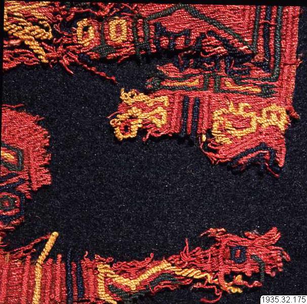 Fragmento de bordo con felini 1935.32.0175 Descripción del motivo: Zoomorfo. Motivo de felinos con apéndices y cola que terminan en felinos de menor tamaño. Del mentón sale una cabeza de felino?. en las garras delantera sostiene una serpiente. Felinos de menor tamaño se presentan dentro de la figura mayor a modo de personaje en el personaje. El motivo se repite en 3 combinaciones de color variando la posiciónde izq a derecha a lo largo del borde. El mismo motivo en menor tamaño se presenta formando una linea de figuras o guarda en el borde interior de la banda. Material y técnica: Tela llana en algodón azul oscuro. Bordado en fibra de camelido en color en amarillo, rojo, verde y azul oscuro. Estilo lineal. Presenta flecos con reborde anillado. Podria ser mismo borde que nr 1935.32.0130 och 1935.32.0172. Época y origen: Intermedio temprano 1 – Paracas Necrópolis