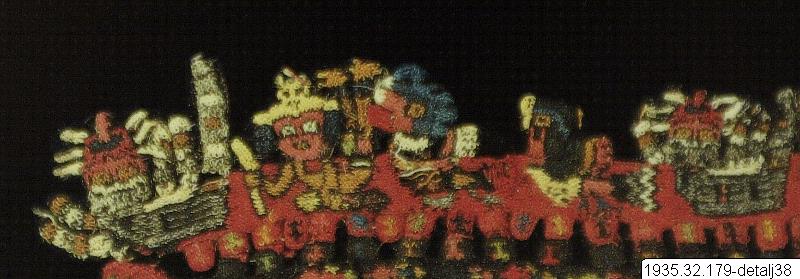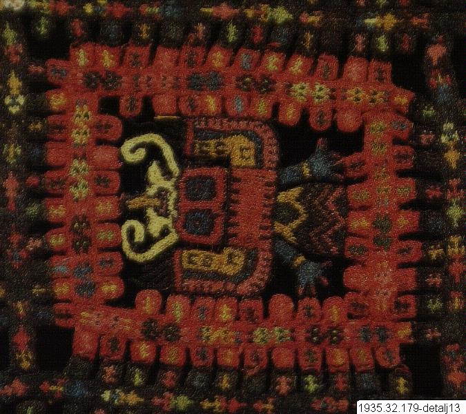 20. En människoliknande figur som bär kjol, pannsmycke, hårprydnader, ett halssmycke och ankelband. Händerna håller en randig stav, en solfjäder och en rotknöl. 21. En fågel med utbredda vingar och en fisk i näbben. Fågeln kan vara en inkatärna (Larosterna inca), som har en tofs med vita fjädrar som böjer sig utåt på sidorna av huvudet. Se även motiv 4 och 11. 22. En människoliknande figur klädd i tunika, benkläder och halsband håller ett troféhuvud och ett oidentifierat föremål. 23. Bakom något som kan vara en blommande växt finns en människoliknande figur som håller en stav, en kniv och ett oidentifierat föremål i sina händer. Han har ankelband och benkläder. Se även motiv 8. 24. En fågel som liknar en falk, om man ser på markeringarna runt ögat, sicksackmönstret på stjärtfjädrarna och vingfjädrarnas mönster. En riktig falk har dock inte de markeringar på benen som denna fågel har. 25. En sammansatt figur som har vingar och stjärtfjädrar som en fågel, men kattlika öron, något som liknar morrhår och en utstickande tunga. Den har också ben med ankelband. 26. Två människoliknande figurer med utslaget hår är fästa vid en växtliknande form som också liknar ett pannsmycke. En av figurerna håller en katt i svansen. Den växtliknande formen i mitten har rötter i en ände, och i andra änden finns ett ansikte med ormliknande band. Se även motiv 10 och 13. 27. En fågel som liknar en falk om man ser till markeringarna runt ögat och mönstret på stjärten. Se även motiv 6 och 12. 28. En människoliknande figur med kropp i form av en böna. Den är klädd i ländkläde och benkläder, och håller en stav och en orm i händerna. Huvudet har morrhår, troligen en ansiktsmask, och ser ut att vara placerat upp och ner på kroppen. Tungan sticker ut och har formen av ett oidentifierat föremål. Ett pannsmycke är fäst vid bönans ”öga”. 29. En människoliknande figur med kropp i form av en böna. Huvudet är vänt uppåt och tungan sticker ut. Figuren har ankelband och håller en rotknöl i ena handen. Vid bönans ”öga” sitter ett ormliknande band, och vid undre delen av kroppen finns ett oidentifierat föremål. 30. Oidentifierat motiv. 31. En människoliknande figur med huvudet bakåtböjt. Den bär en tunika med ärmar, ett halsband, ankelband och har ett oidentifierat föremål runt ena armen. I händerna håller figuren en rotknöl och en böjd stav från vilken det hänger två föremål som kan vara klockor eller bjällror (se även mantel 1935.32.0209). Framför kroppen och huvudet finns något som kan vara en blommande gren med rötter. 32. En människoliknande figur med ländkläde, pannsmycken och ankelband. Figuren håller en blommande rotknöl till sin mun medan andra armen håller fast en kniv. Liknar motiv 15. Bården runt textilens kant består av fyra olika motiv som upprepas systematiskt. Dessa motiv är ett kattdjur (troligen pampaskatt, Oncifelis colocolo eller Leopardus colocolo), en fågel som kan vara en falk, en oidentifierad fågel, och en människoliknande figur med kjol, ankelband, pannsmycke, hårprydnader, stav, solfjäder och rotknöl. I hörnet vid figur 25 saknas ett av motiven i ordningen. Material och teknik Broderad med ullgarn på bomull. Motiven är sydda med täta öglestygn 10-14 cm runt stomme av antingen vävda eller flätade band eller enskilda trådar, beroende på grovleken på de färdiga detaljerna. Motiven i rutorna är troligen sydda separat och sedan ihopsydda med bårderna. Datering och ursprung Paracas Nekropolis, Intermedio Temprano 2 (ca 100 e.Kr. – 200 e.Kr.)
