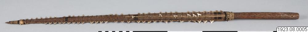 The waters around Kiribati are today a magnet for commercial fishing vessels from Europe, Asia and America. This sword was collected in the period around 1880–1890, before the commercial shark fin industry was established in the early 20th century and shark populations began to shrink. Shark fin fishing is a billion dollar global industry that kills over 100 million sharks annually for their fins. Which species the teeth on these swords came from has not been analyzed.