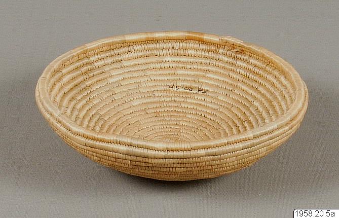 Flätad dosa för ägg. Består av två kupiga "korgar" vilka sättas ihop så att en ask bildas. Diameter 20 cm. Flätning i spiralteknik. Insaml. och Gåva av: Vera Miles, Göteborg. 15/7