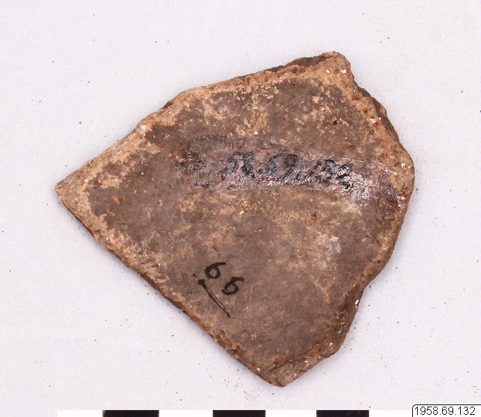 5,5 cm hög skärva av lergods. Vid kanten svaga trekantiga intryck i godset. Från Övre Essequiboflod- området. Orig. nr i bytessändningen 66 (=Site number E-1) = "Kanashen, Surface". Av insamlarna förd till kategorin "Kassikaityu Punctate".
