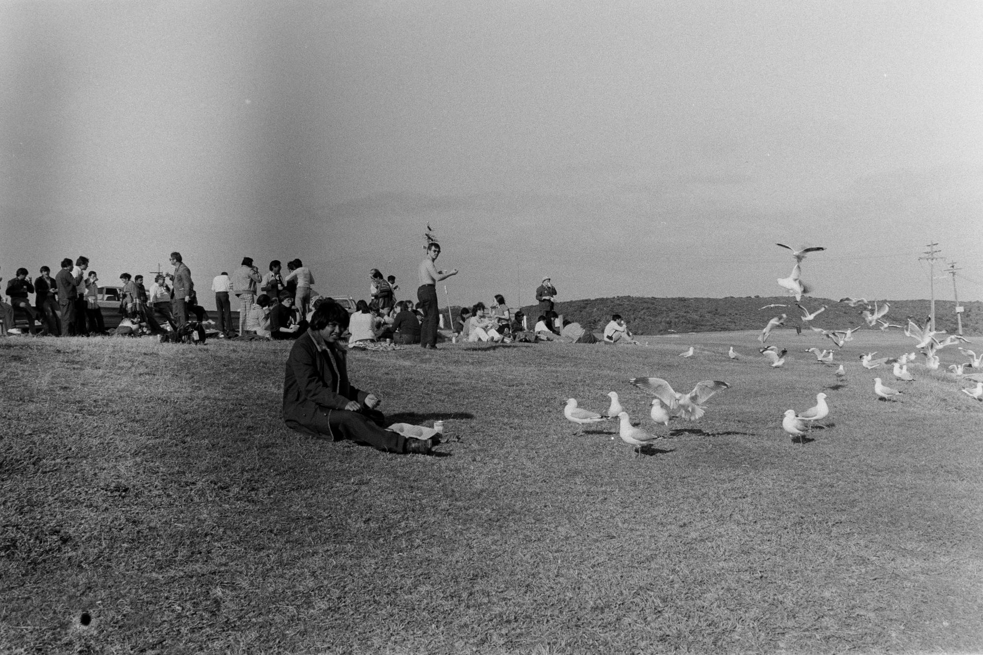 • Mycket folk som ser uta att äta och dricka finns i övre vänstra hörnet på en gräsmatta. I blickfånget mitt i bild sitter en person med svart hår som ler. Framför personen flyger och står måsar. I bakgrunden syns elstolpar och en skogsås.