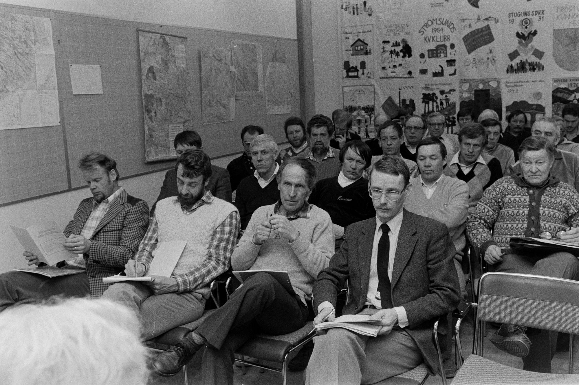 • På mötet sitter bara män i olika åldrar från ungefär 30 till 80 års ålder. De har antckningsblock på knäna och pennor i händerna. De som finns på bilden verkar jobba inom skogsbruket och från samebyar. På väggen bakom finns planscher som det bland annat står Strömsunds KV Klubb. På en annan vägg finns kartor. På arkivfickan där bilden hittades står det markerat: Skogsvårdsdag Östersund mars -82.