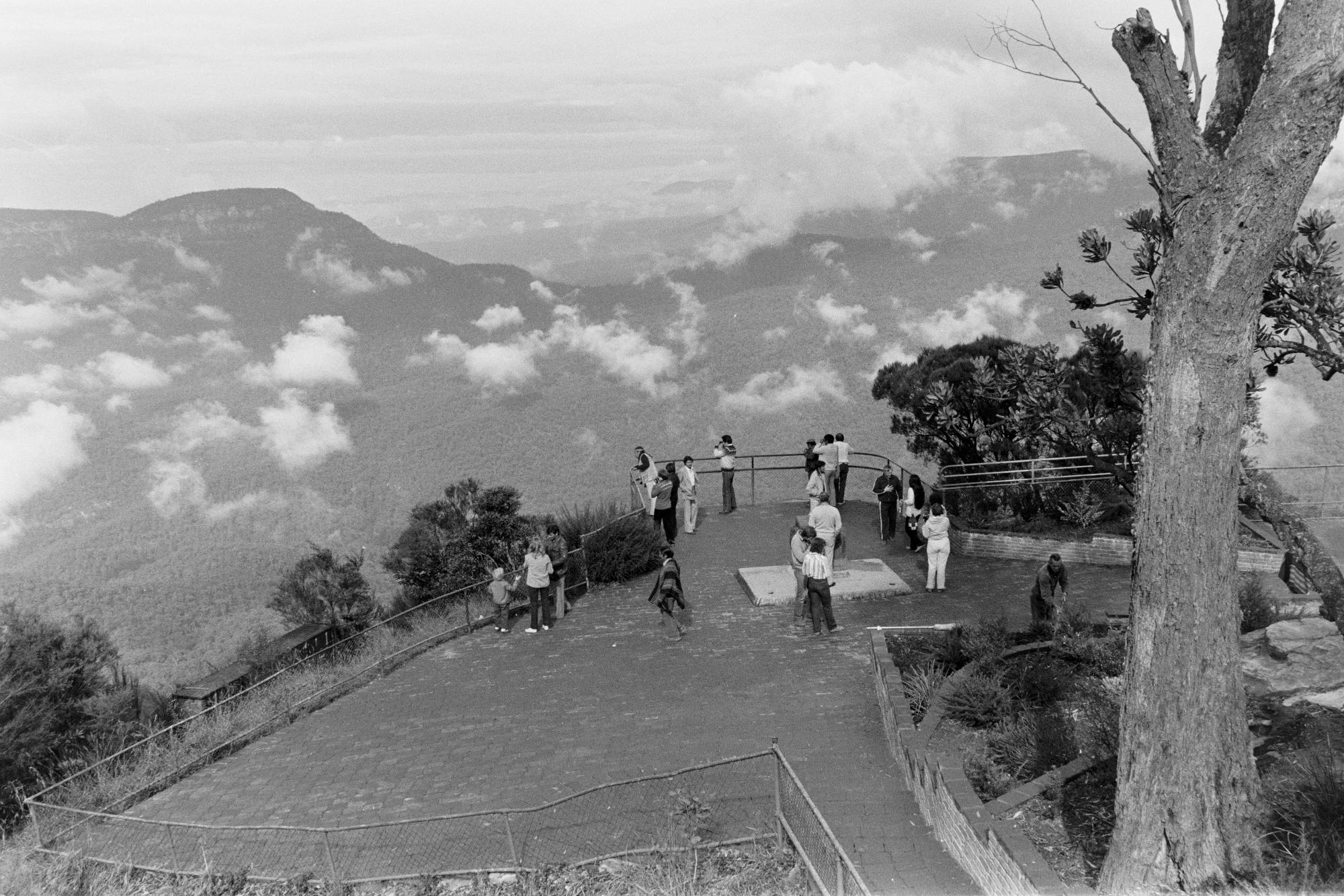 • Människor på utkikspunkt i Australien. Högt uppe i de australiska bergen finns iordningställda utkikspunkter efter vägarna, som denna.